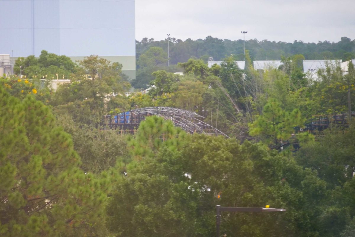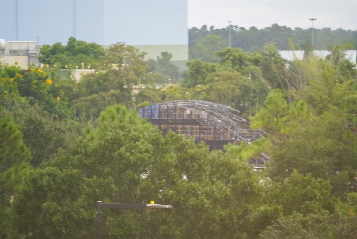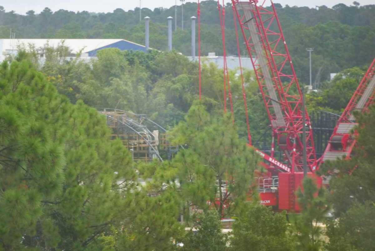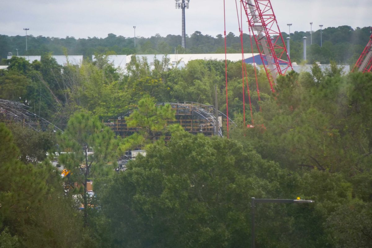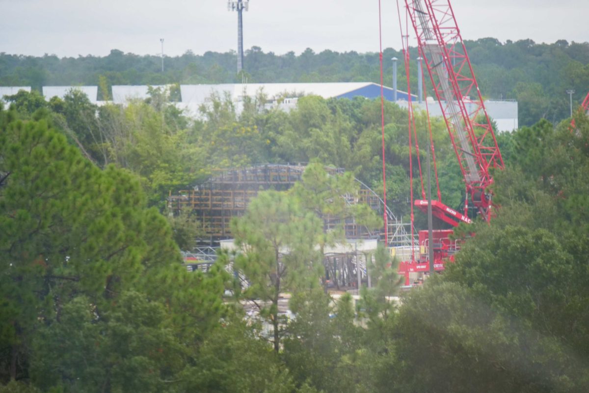 From the Skyliner, we can see the top of one barge emerging from the treetops. The structure looks like a semicircle. The gray structures at the top are likely arms that will move during the show. The building in the background is the Guardians of the Galaxy: Cosmic Rewind show “gravity” building.