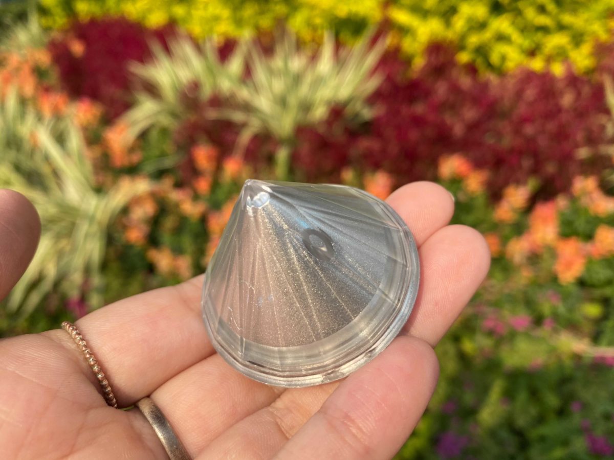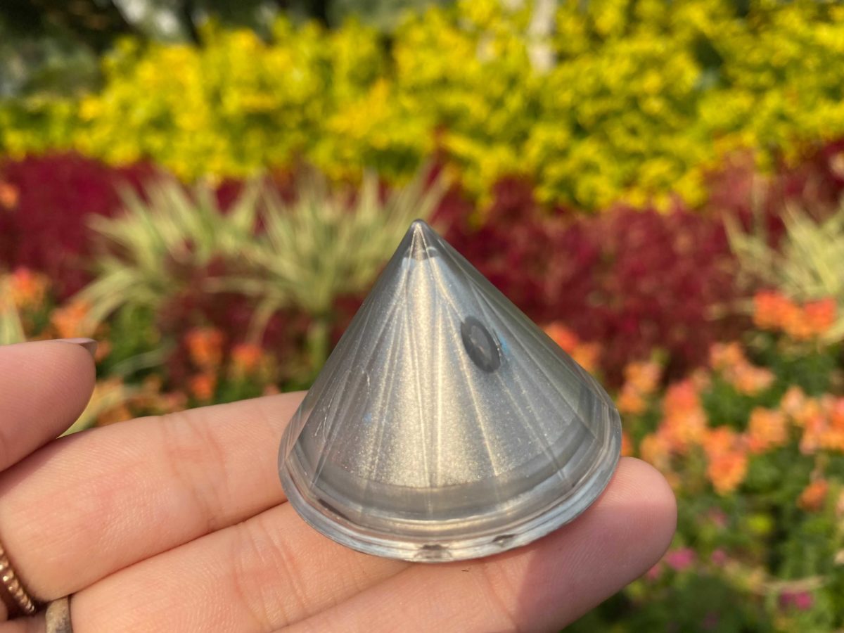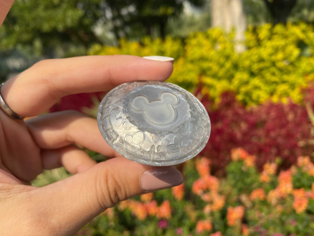 The “cube” is actually diamond-shaped. The top has one large Mickey head silhouette, with several smaller ones around the sides.
