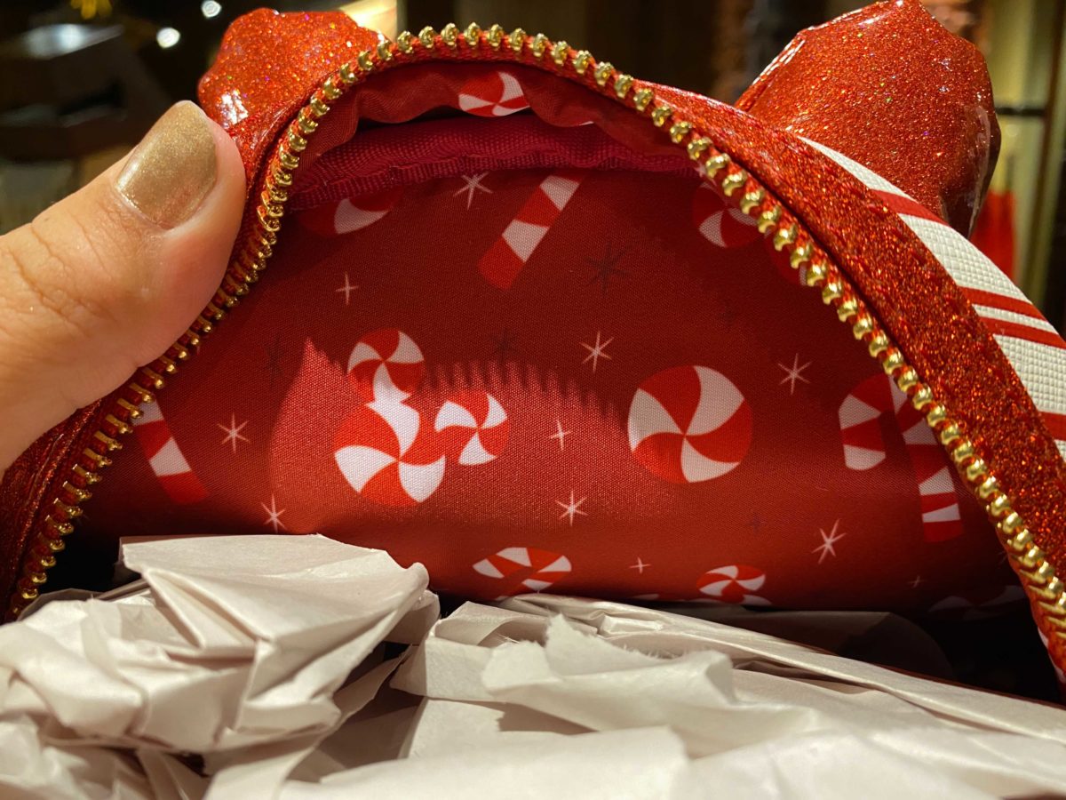 Inside, the fabric lining features a pattern of Mickey-shaped peppermint candies and candy canes.
