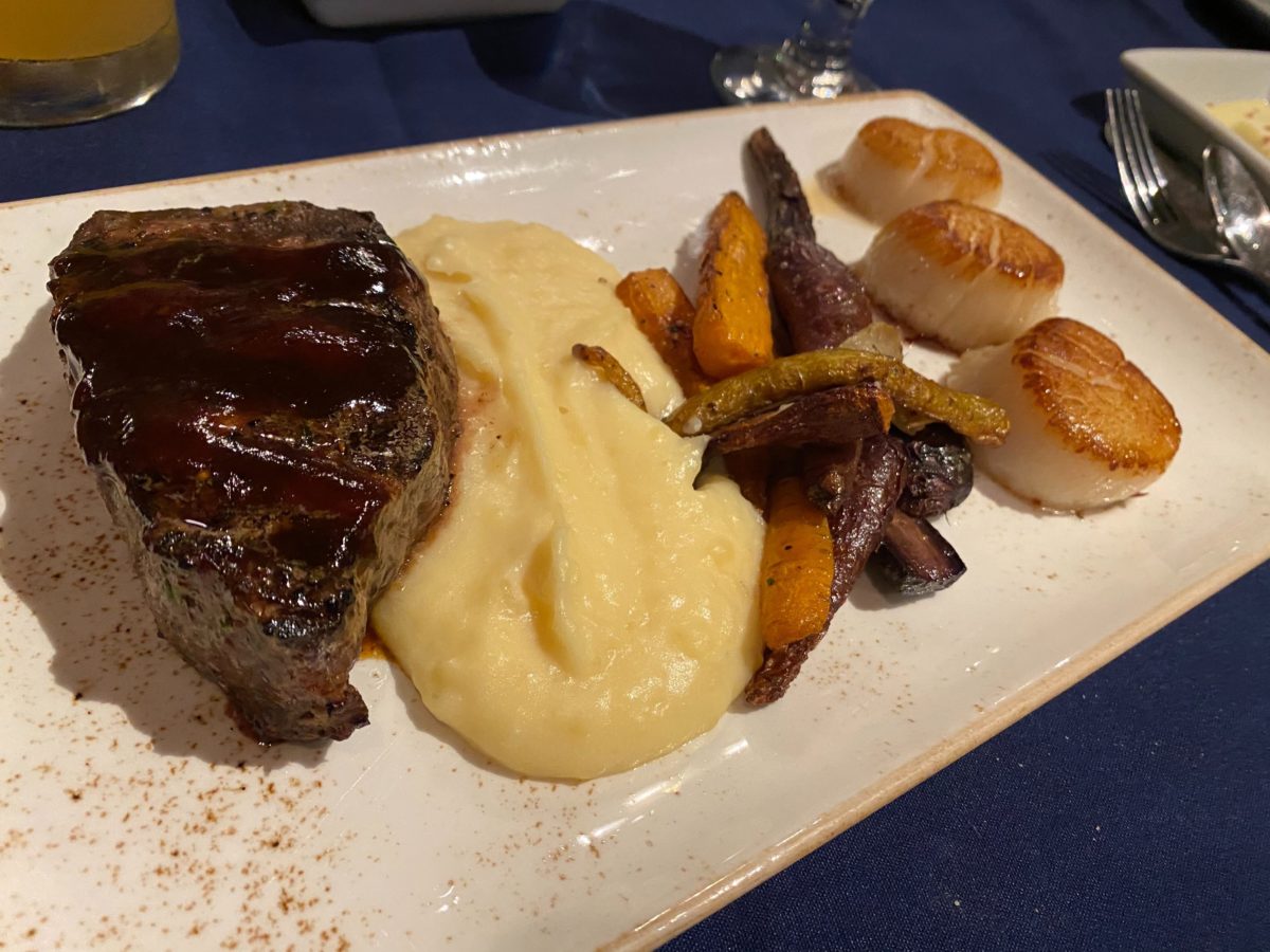How could we go wrong with a tender steak, scallops, and mash potatoes? This mixture of land and sea has often filled a delicious dish for fine dining restaurants. The coloring of the steak and scallops promised tenderness and flavor. We even upgraded to the filet mignon to ensure that we tasted a great cut of beef.
