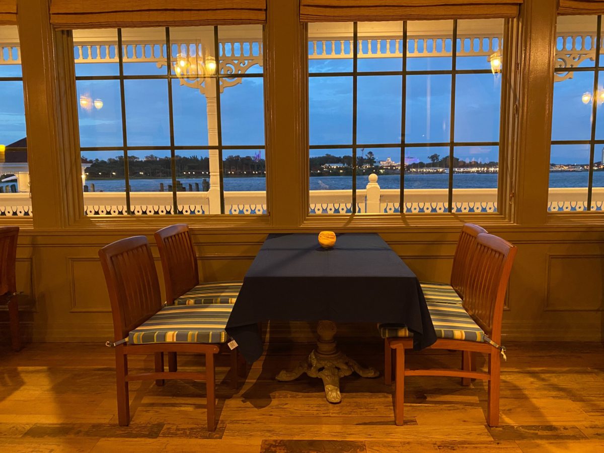 The stunning view from the dining room oversees the Seven Seas Lagoon. Whenever fireworks or the Electrical Water Pageant might return, it’s worth noting that guests not even dining at the restaurant are allowed to crowd the patio and block the view from inside.