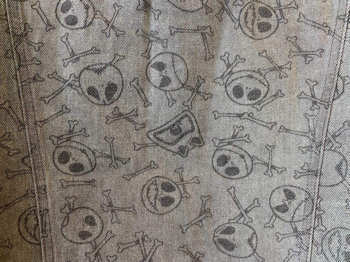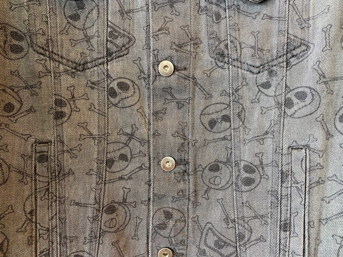 The pattern on the jean jacket is a play on skull and crossbones with Jack Skellington’s face. The jacket is also light wash and perfectly colored to pair with a denim on denim look. Each skull depicts different Jack emotions.