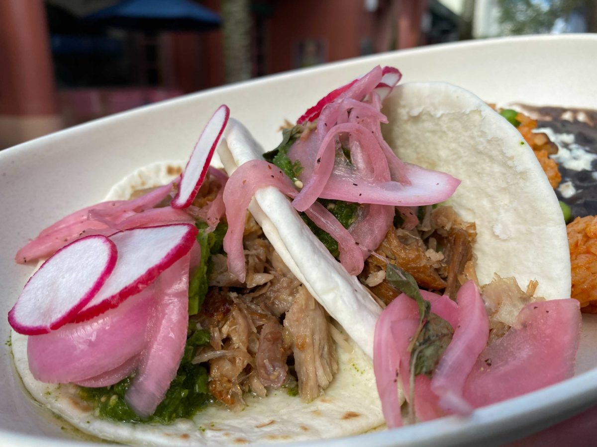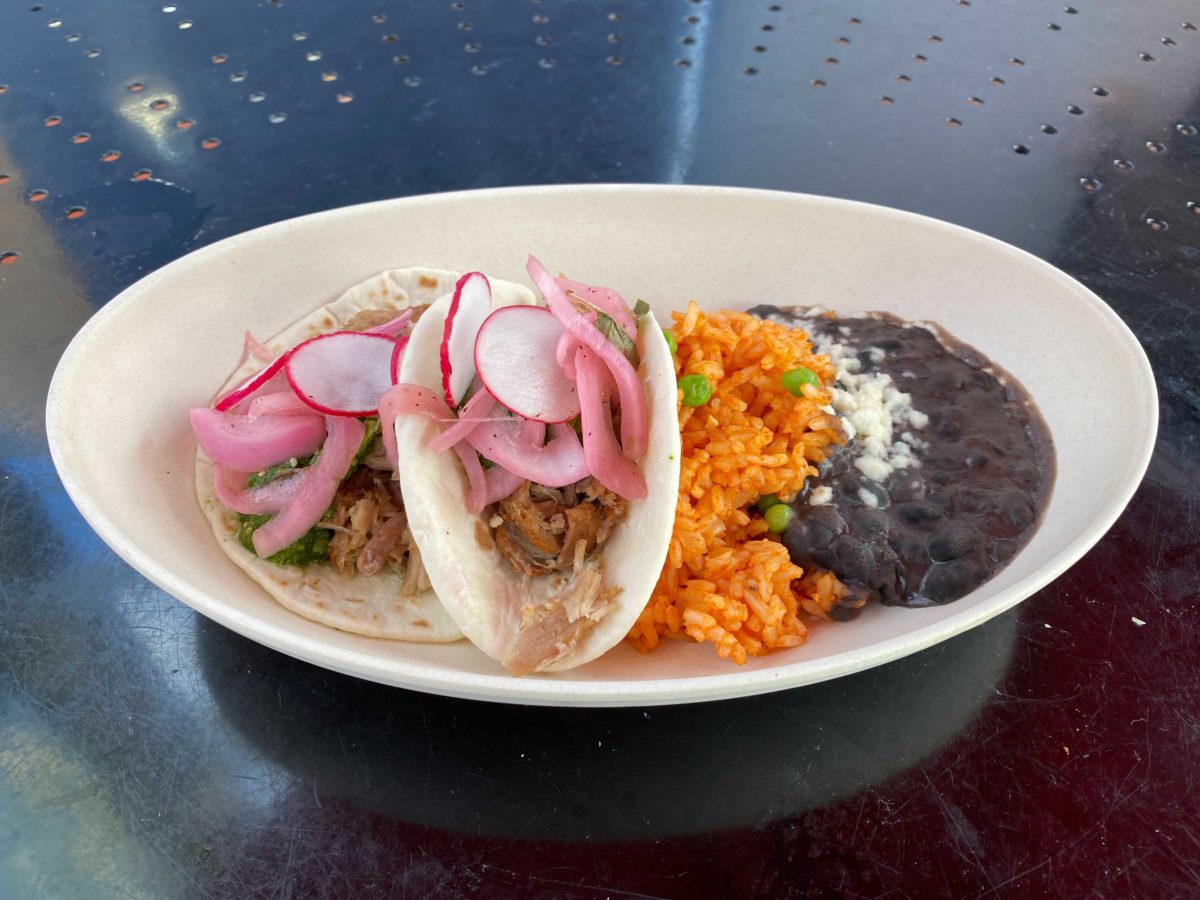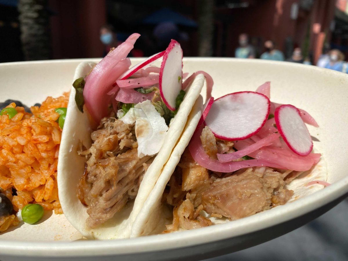 Pork Carnitas on Flour Tortillas topped with Salsa Verde, Pickled Onion, and Radish served with Mexican Rice and Black Beans topped with Queso Fresco