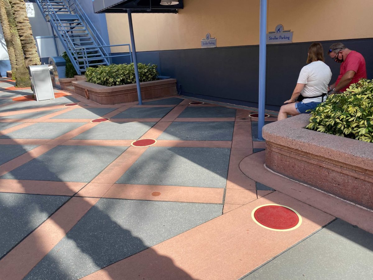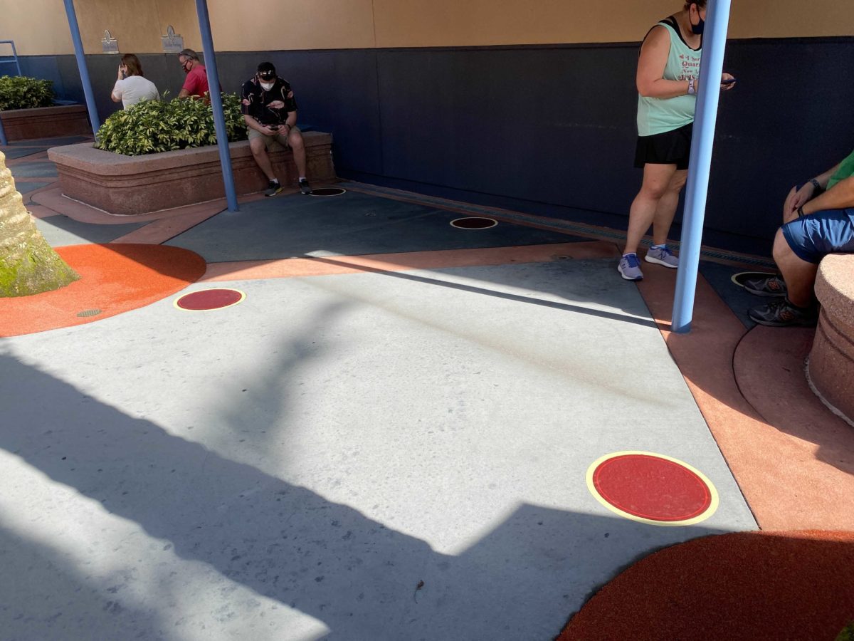 Guests waiting for their mobile order are directed to this partially covered area with socially distanced dots.