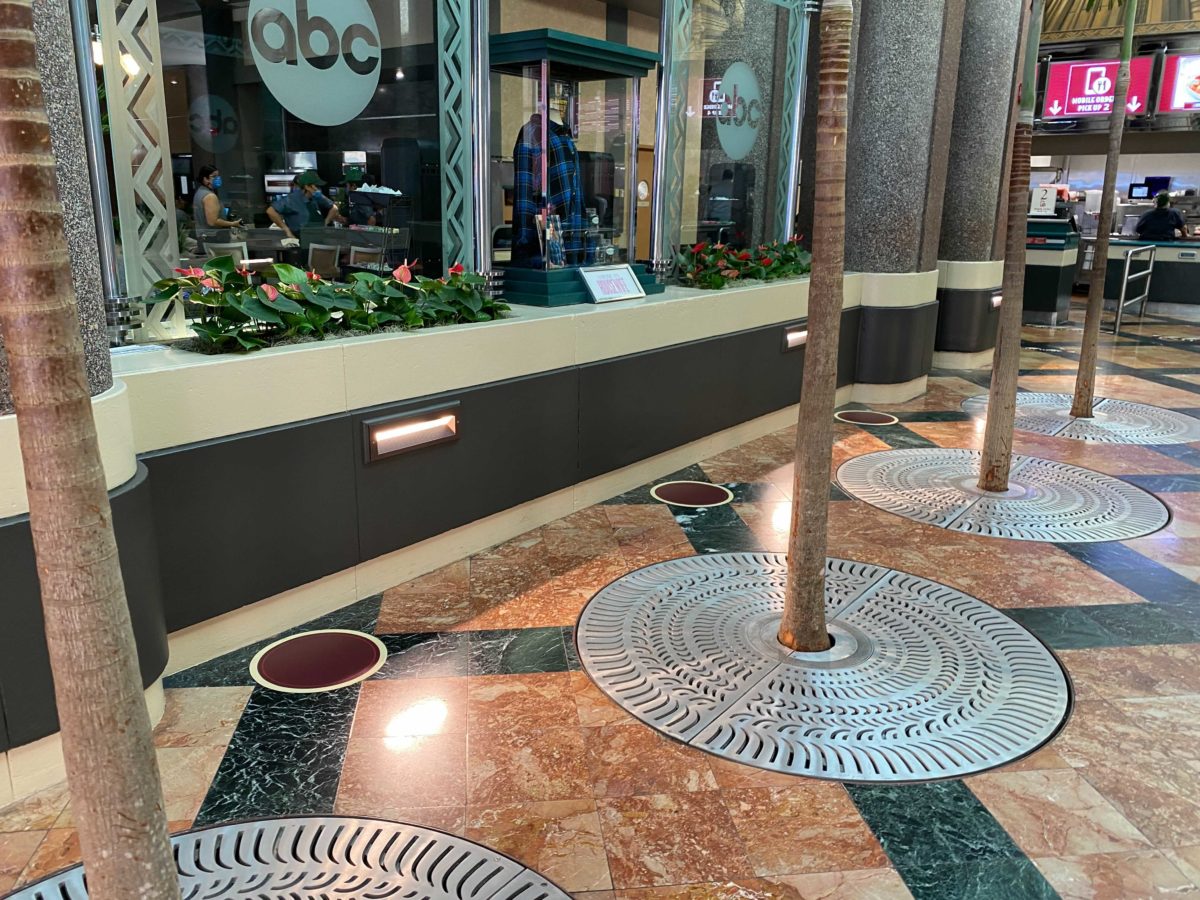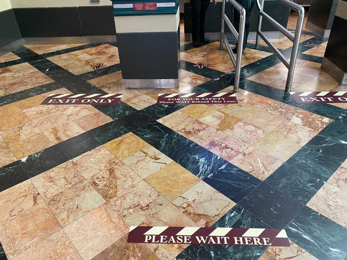 Inside, there are hand sanitizer dispensers and more social distancing markers.