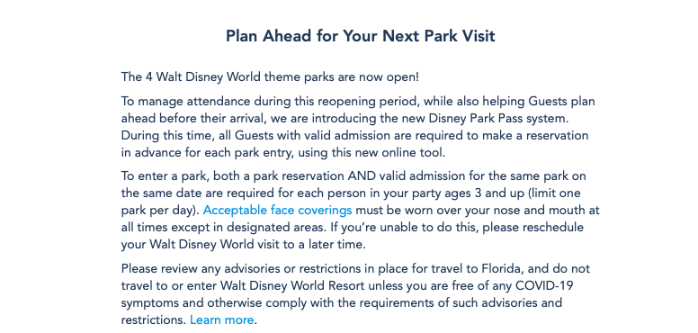 Walt Disney World has updated verbiage on their “Know Before You Go” landing page to further stress the importance of properly wearing a face mask in the parks and throughout property. If guests are unable to commit to wearing acceptable face coverings over their nose and mouth at all times, Disney asks that they simply reschedule their visit: