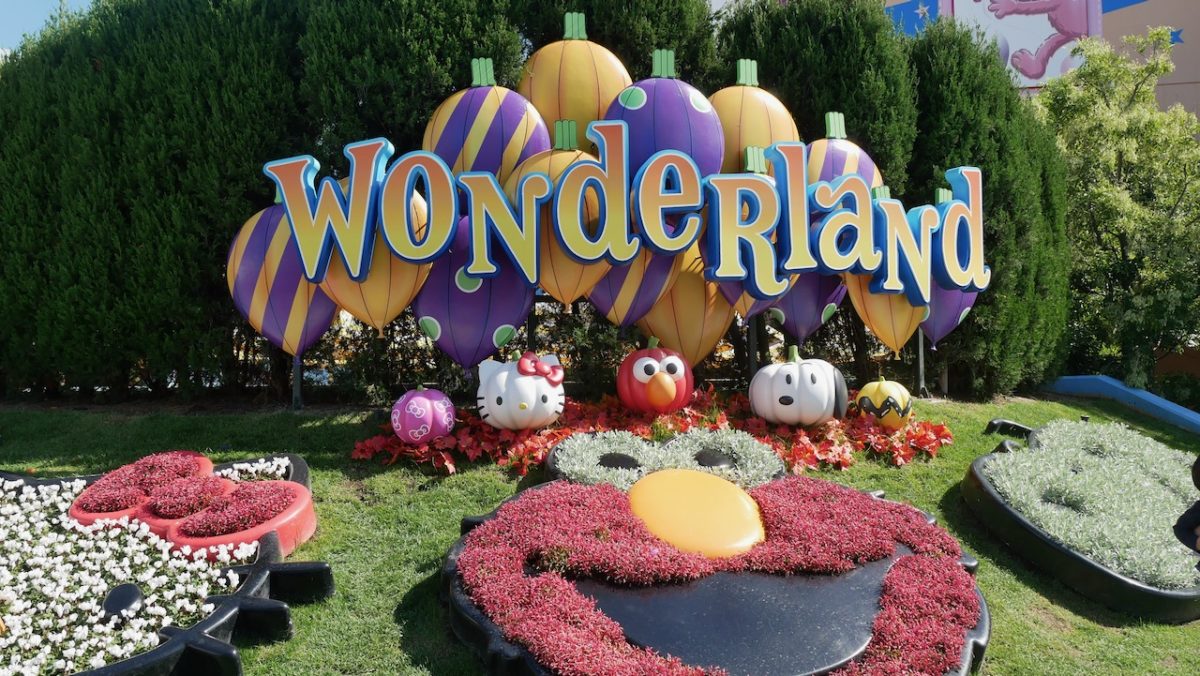 Over in Universal Wonderland, the entrance statues and sgins feature silly Halloween costumes for Elmo, Hello Kitty, and Snoopy! There’s also appropriate pumpkins underneath the “Wonderland” sign!