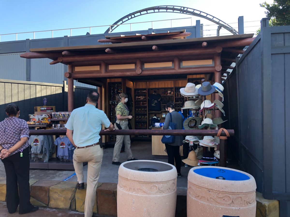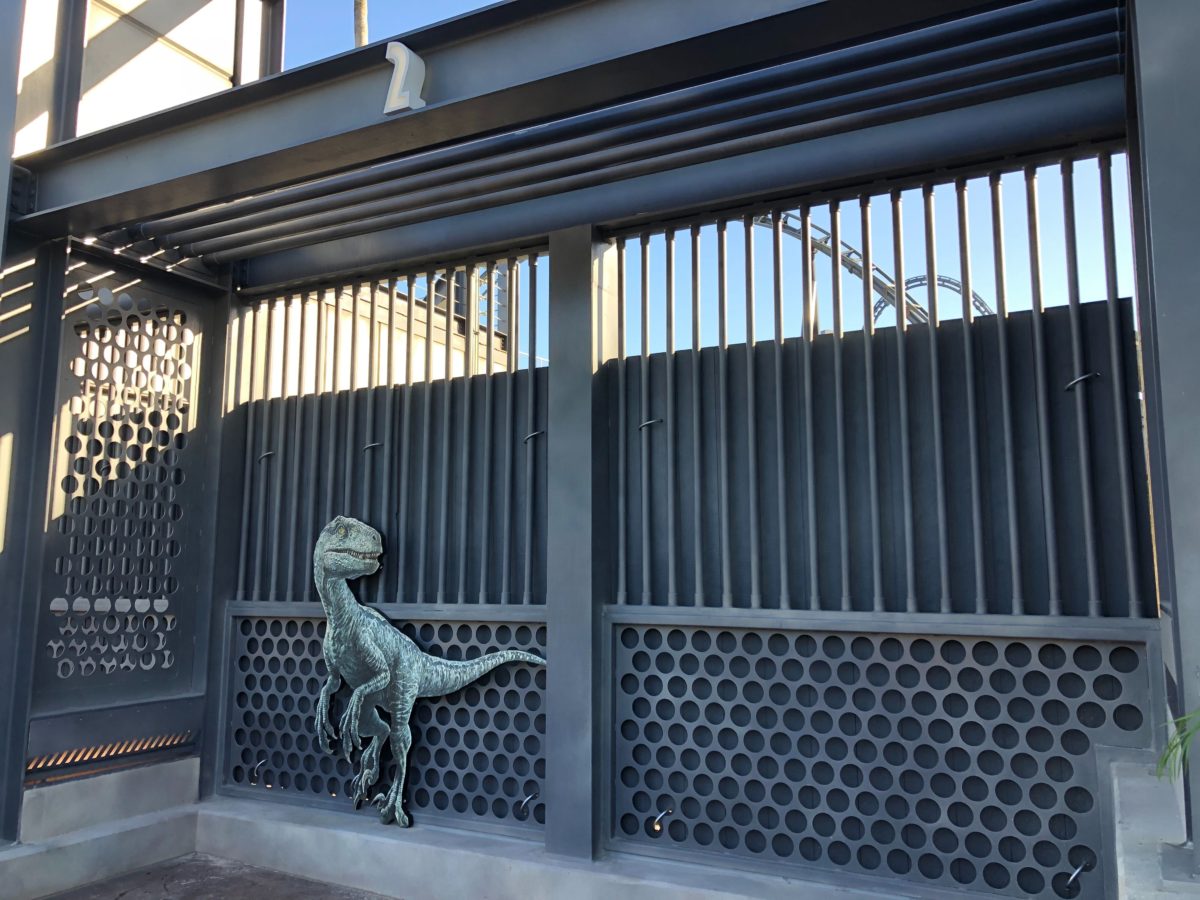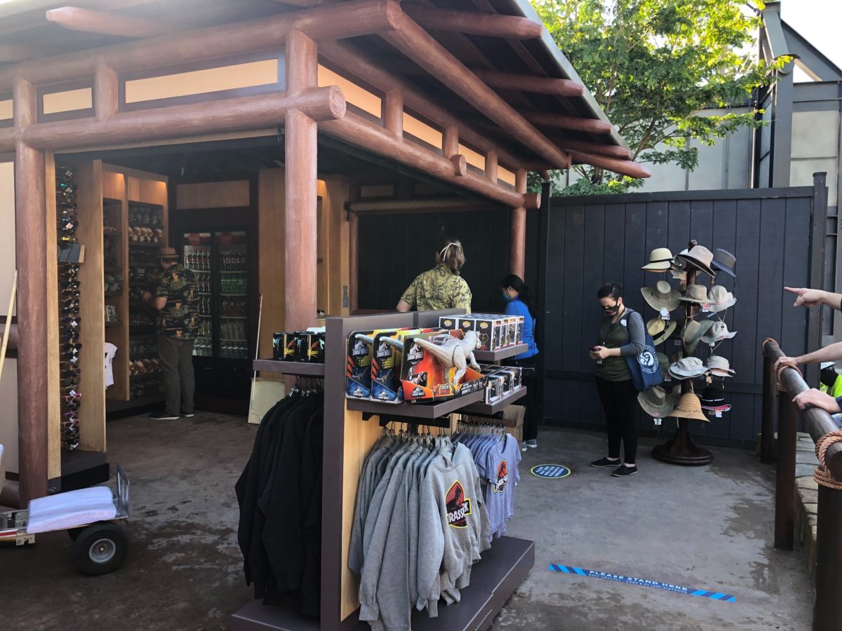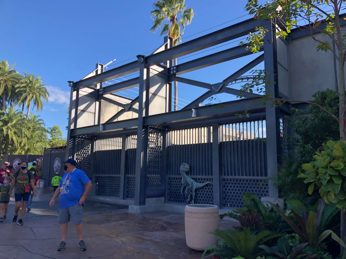 Some construction walls have come down next to Jurassic World VelociCoaster in Universal’s Islands of Adventure, fully revealing the new raptor paddock and a merchandise kiosk.