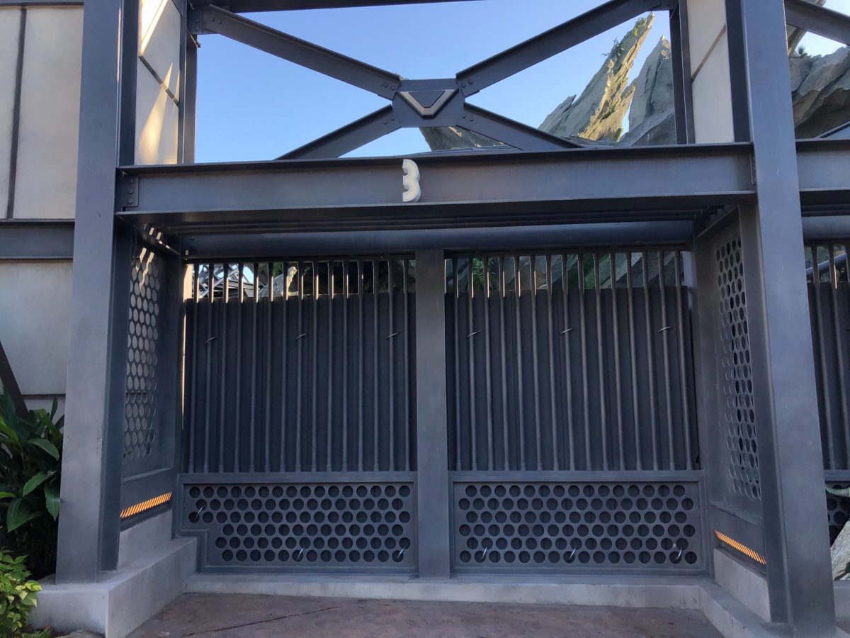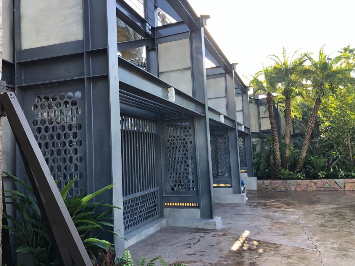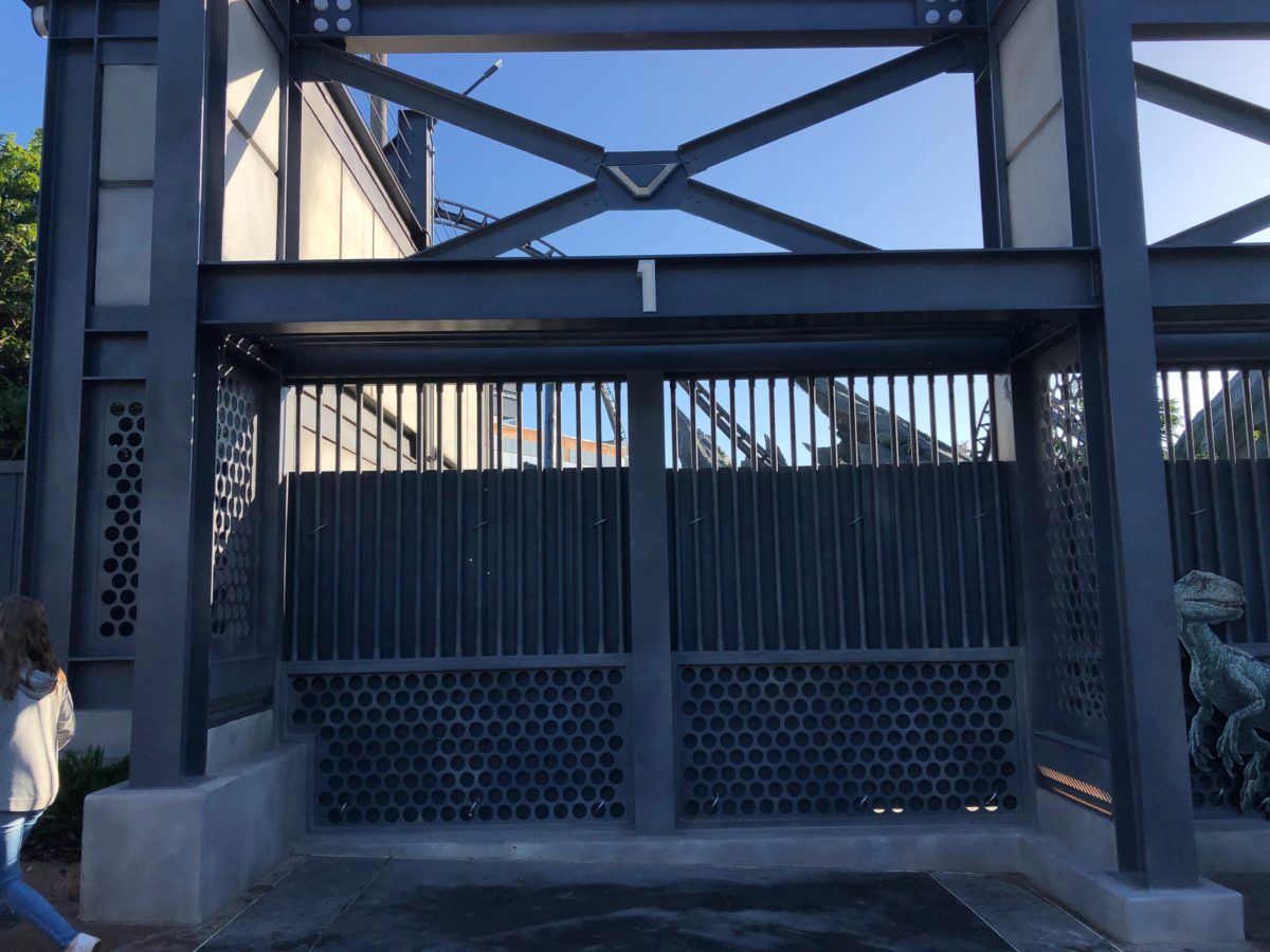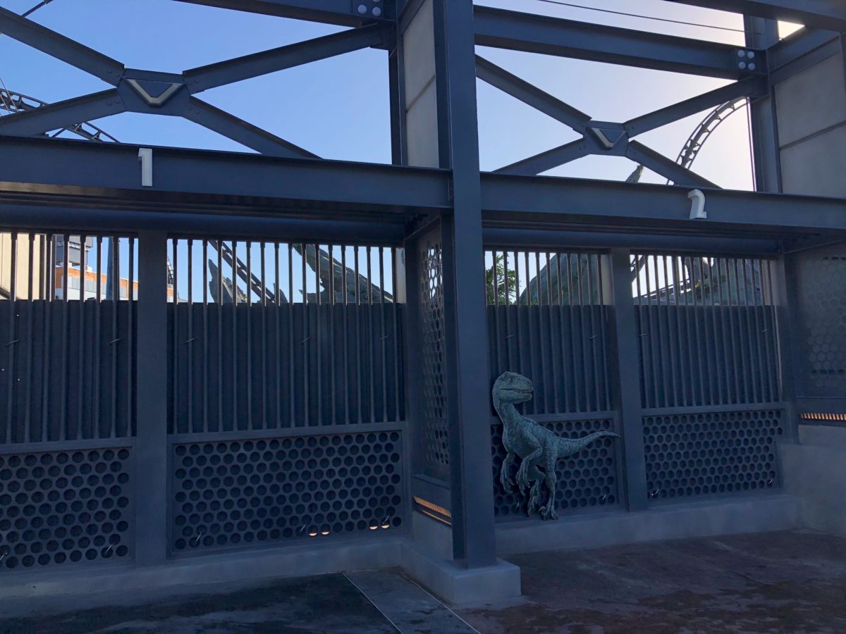 These are directly across from Jurassic World Raptor Encounter Experience. Back in August, we noticed the gates first being built. The black strip of pavement between the paddock and the Raptor Encounter suggests that velociraptors are transferred back and forth between the two.