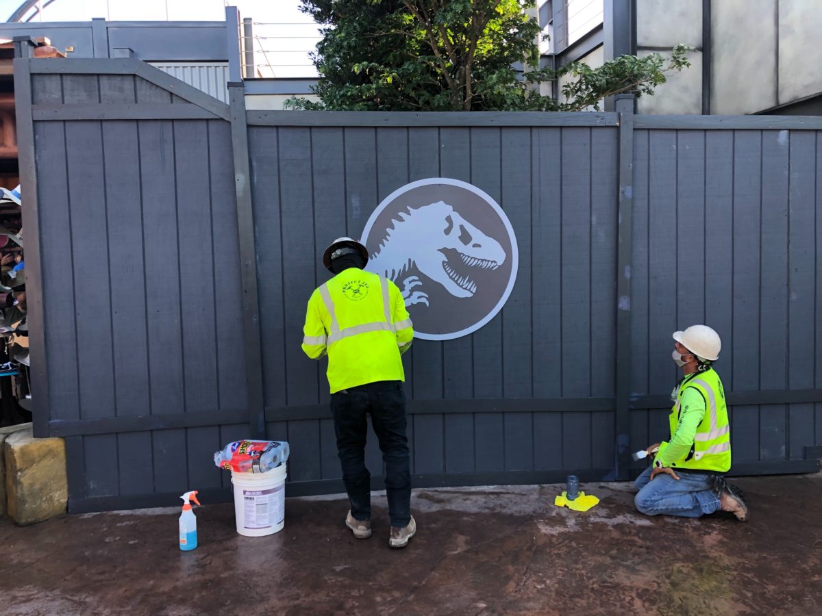 Plenty of construction walls still remain while Jurassic World VelociCoaster is still under construction. A couple of workers seemed to be sprucing up this wall.