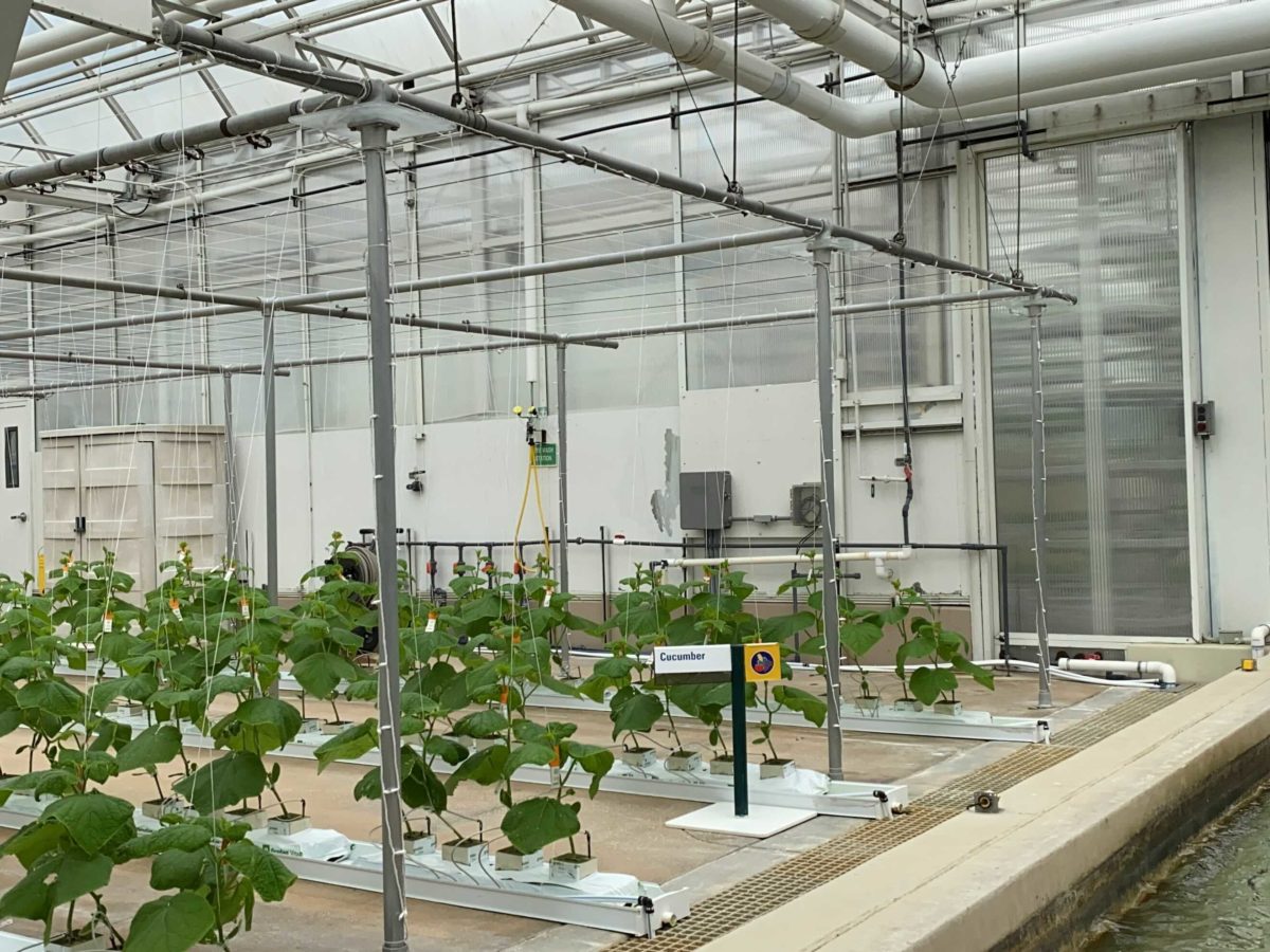 More lights surround the irrigation pipes for the cucumbers.
