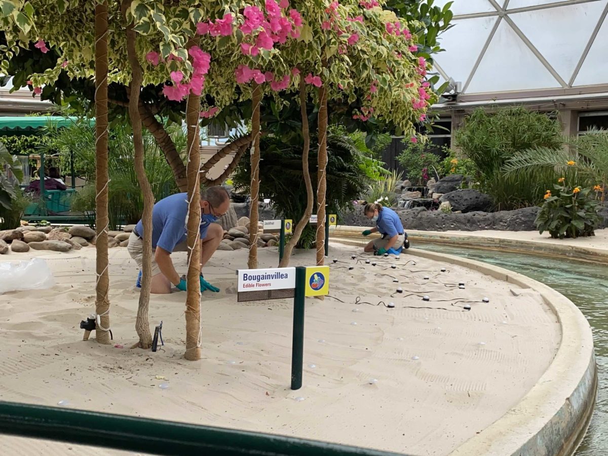 Light installation is still ongoing at Living with the Land in EPCOT, which turns the futuristic attraction into a seasonal holiday celebration.