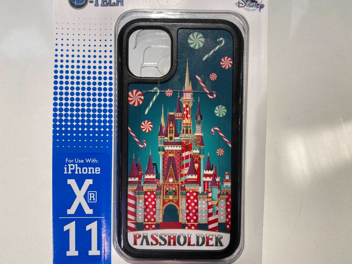 This phone case also features the gift-wrapped castle, now with candy canes and peppermints surrounding it.