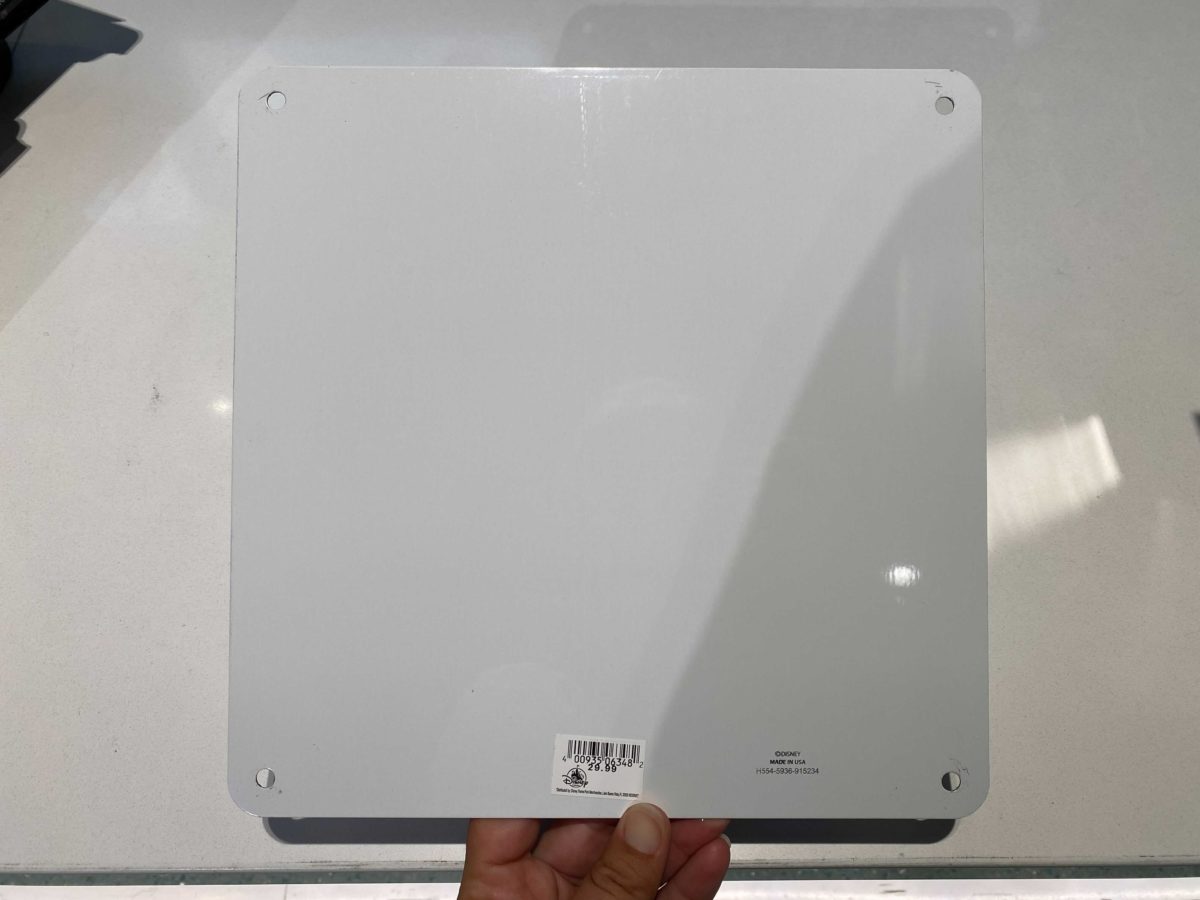 This tin sign makes a perfect statement piece in a Disney fan’s home. Cinderella Castle is surrounded by a winter wonderland, including a Mickey snowman in the background.