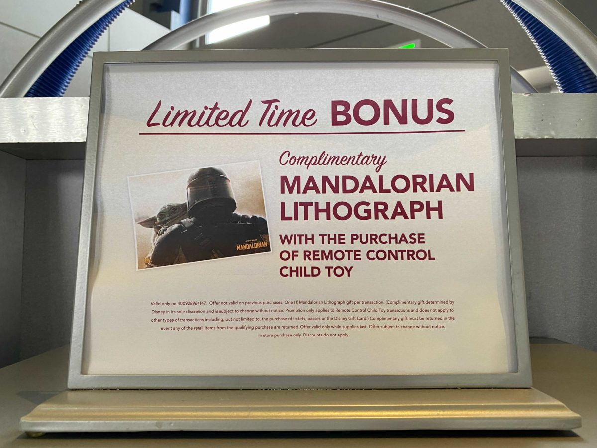 If a Baby Yoda plush, shoulder plush, backpack, ear headband, and more is still not enough Baby Yoda for you, then don’t worry—Walt Disney World has a new remote-controlled Baby Yoda. For a limited time, you can also get a complimentary Mandalorian lithograph with a purchase of The Child.