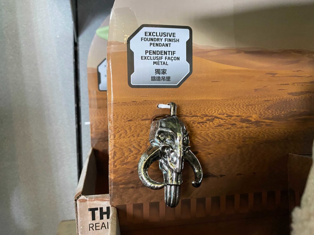The Child also comes with his pendant of Boba Fett’s symbol, seen at the end of the first season of “The Mandalorian.”