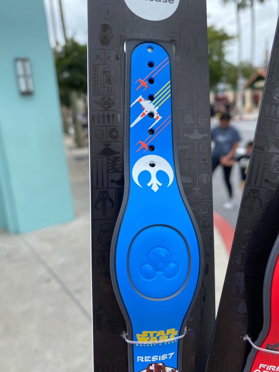 The Resistance band is blue, with X-Wings flying by and leaving stripes of red and yellow behind. The Star Wars: Galaxy’s Edge logo is a matching yellow, with a white Rebel alliance symbol found on one half of the band, and a rebel helmet on the other half.