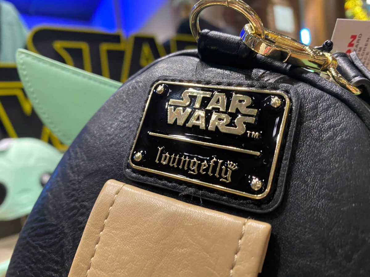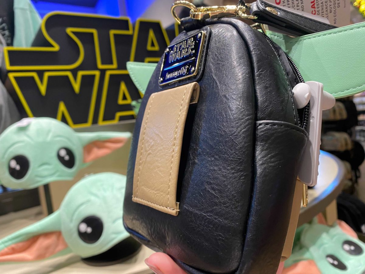 The Loungefly wristlet is topped with a cute version of Baby Yoda. His eyes are filled with wonder. The front zippered pocket forms The Child’s body.