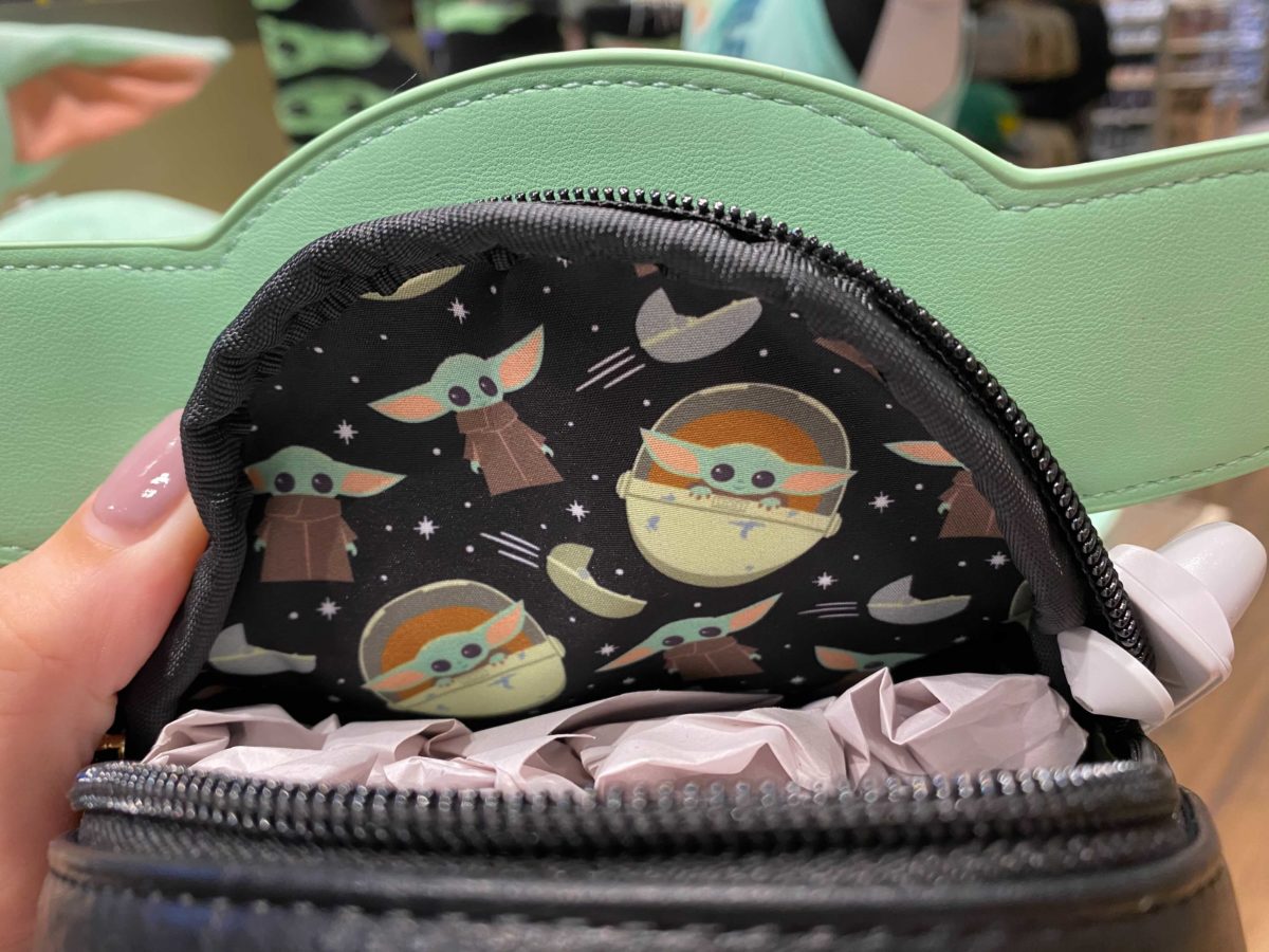 The lining is covered with cartoon versions of Baby Yoda and his carriage.