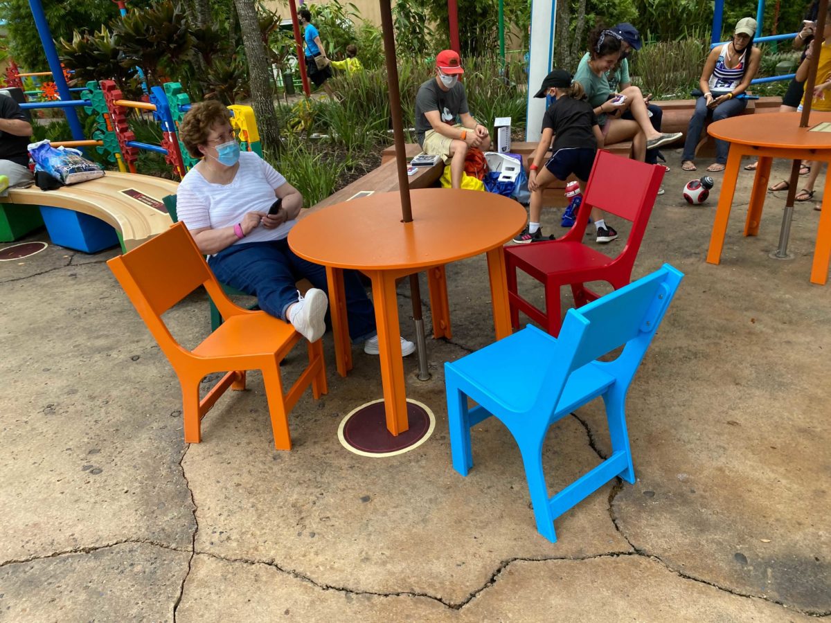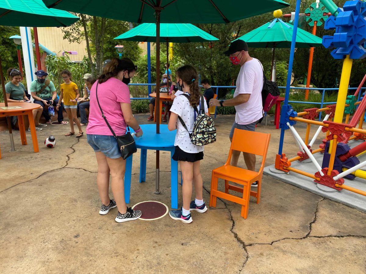 New markers have been placed at tables by the counter-service restaurant in Toy Story Land, which has been closed since the park reopened in July.