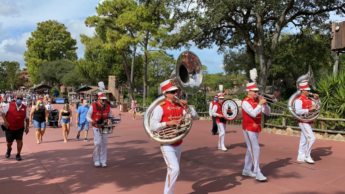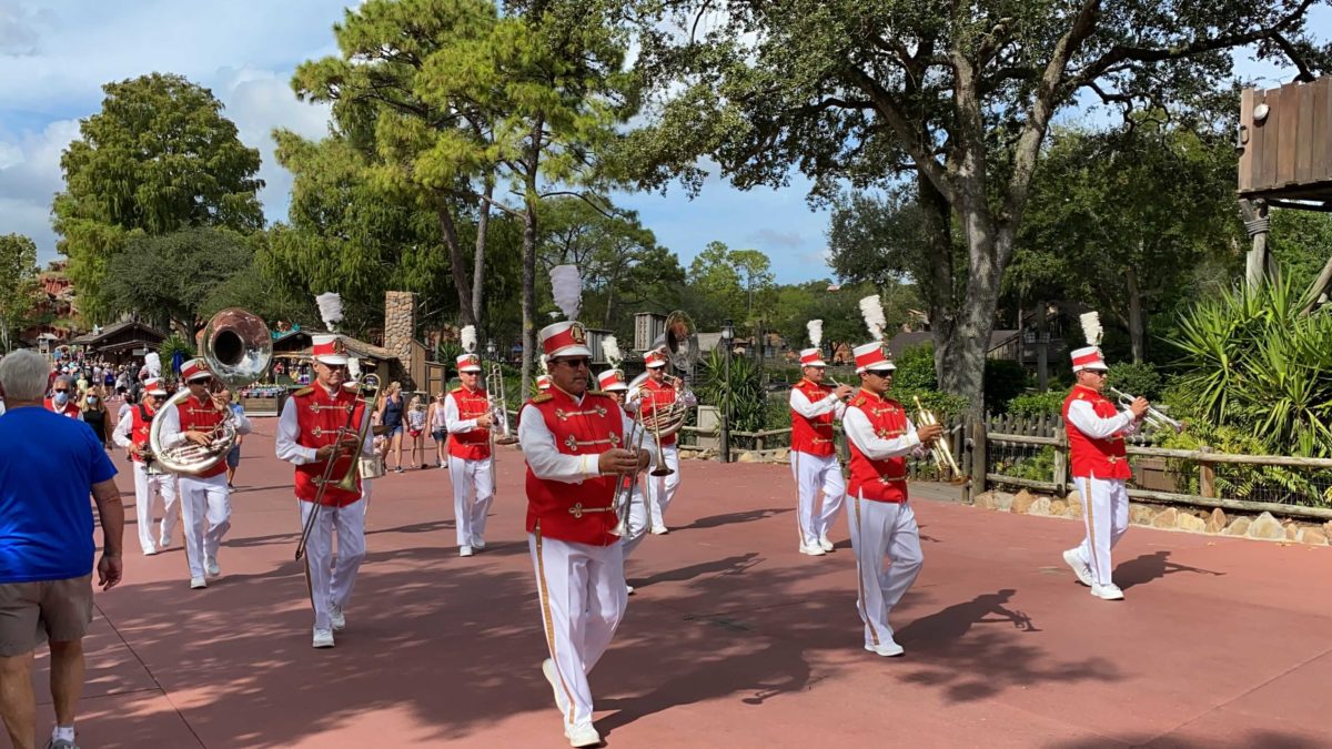 The platoon leads the march of the Main Street Philharmonic as they make their way through Frontierland.
