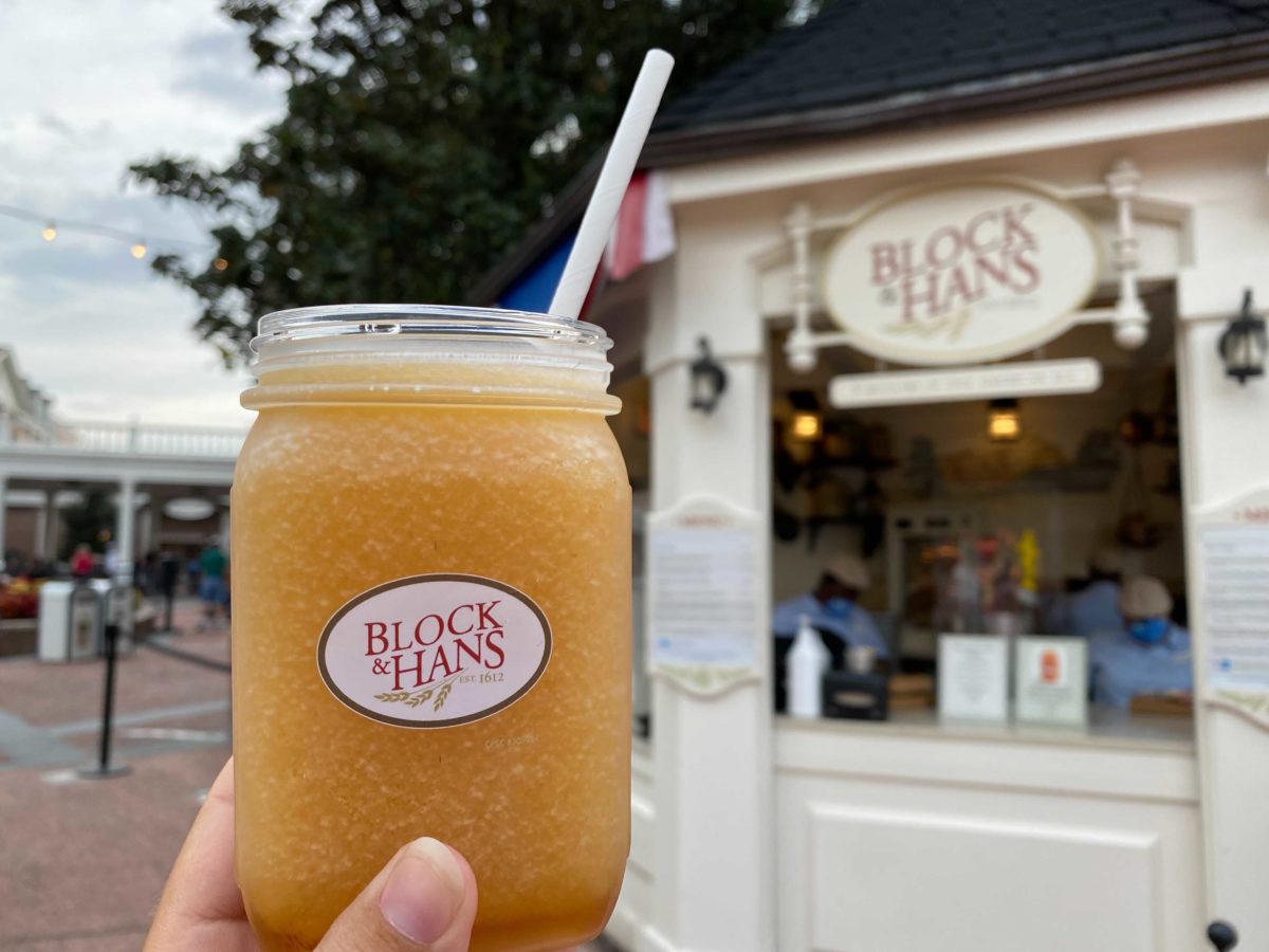 Spiked Frozen Apple Pie is now available at the stand, served in a plastic Mason jar featuring the Block & Hans logo. This is an early release for this year’s Taste of EPCOT International Festival of the Holidays, and a return from previous years of the festival as well.