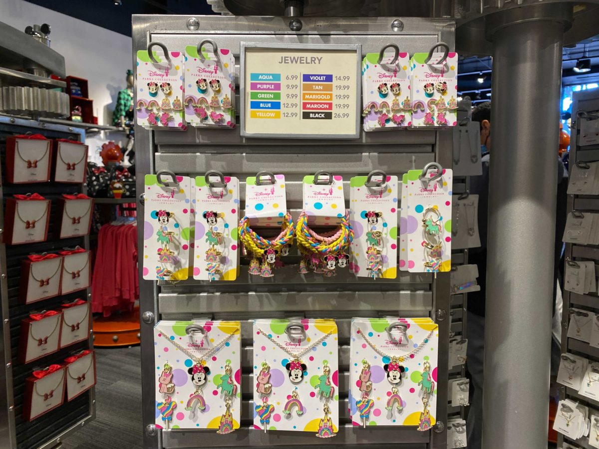 A new series of Minnie Mouse costume jewelry just arrived at Walt Disney World! The series features colorful artwork, with Minnie Mouse as the main attraction. The costume jewelry sets also feature rainbows, castles, unicorns, cats, and lollipops.