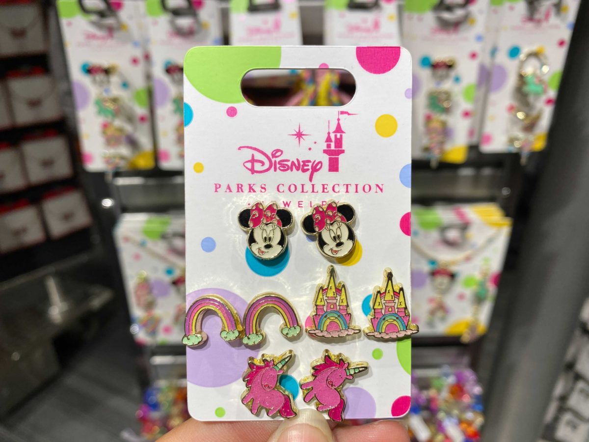 The set includes four pairs of earrings. In addition to Minnie, the set has rainbows, a colorful castle, and a pink unicorn.