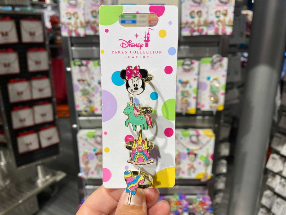 The ring set includes four unique rings: Minnie, a unicorn, a castle, and a lollipop.