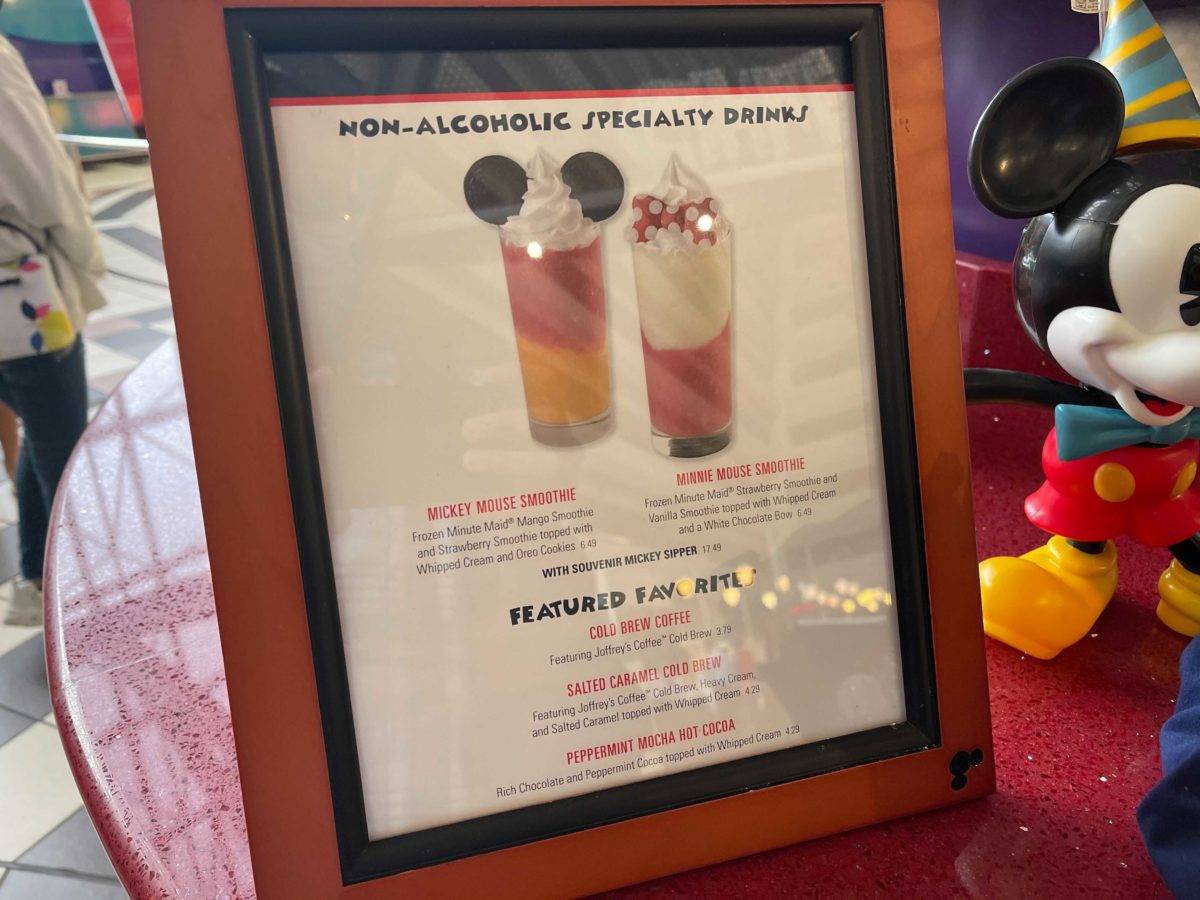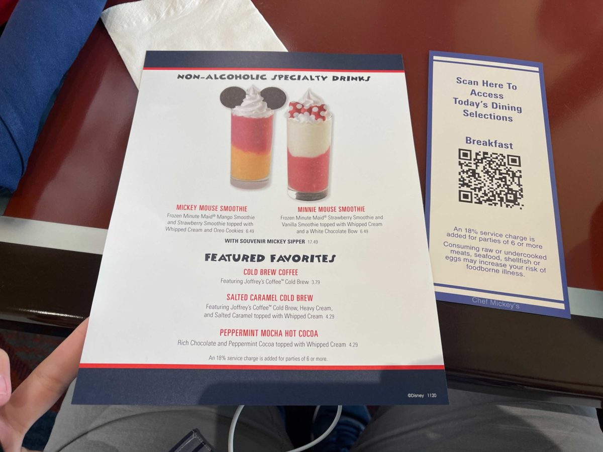 They seemed to be pushing these non-alcoholic smoothies themed to Mickey and Minnie Mouse at the front desk, served in the old Mickey Celebration Sipper for $17.49. Other “Featured Favorites” include Cold Brew Coffee, Salted Caramel Cold Brew, and Peppermint Mocha Hot Cocoa. As always, the buffet includes your choice of beverage, from soft drinks, to coffee, juice, and/or tea. (And yes, there’s POG juice.)
