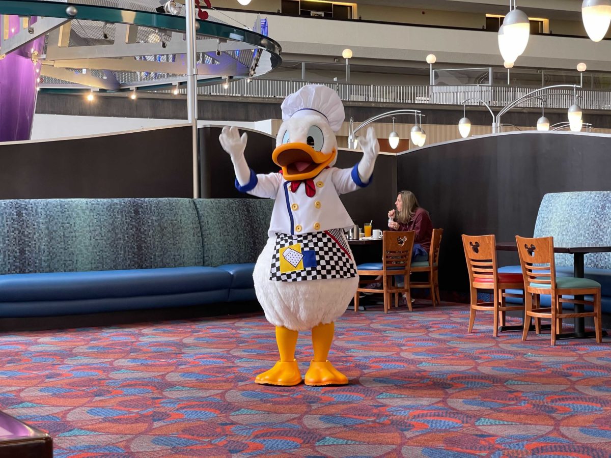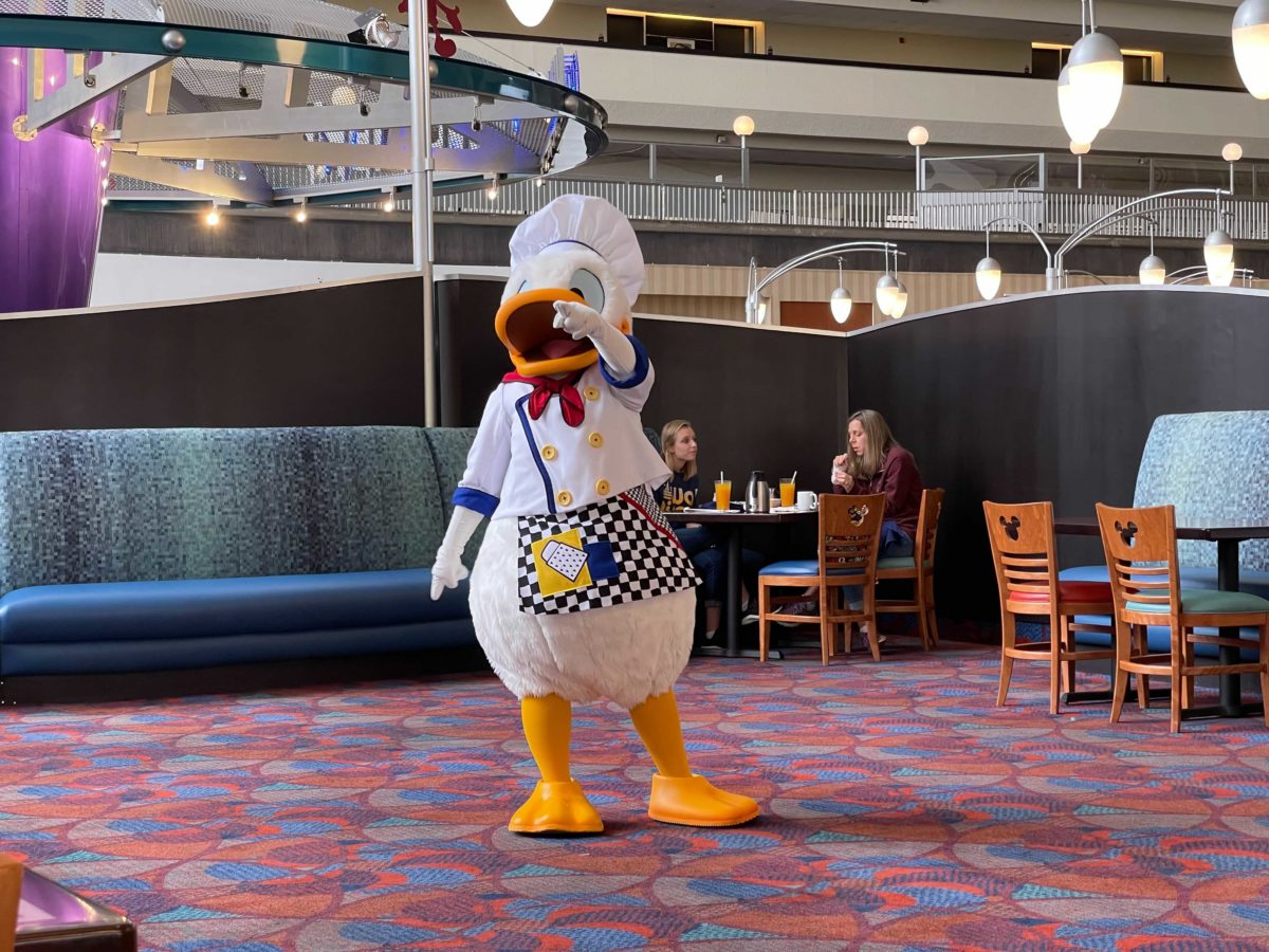 One main difference from our last time here is that they’ve removed even more tables to make room for distanced characters. Most tables ran along the edges of the restaurant where the booths were, for characters to be able to stand in the middle of these areas and pose for photos. We did notice that the characters didn’t get as close up to the tables as they did in restaurants like Topolino’s Terrace, though.