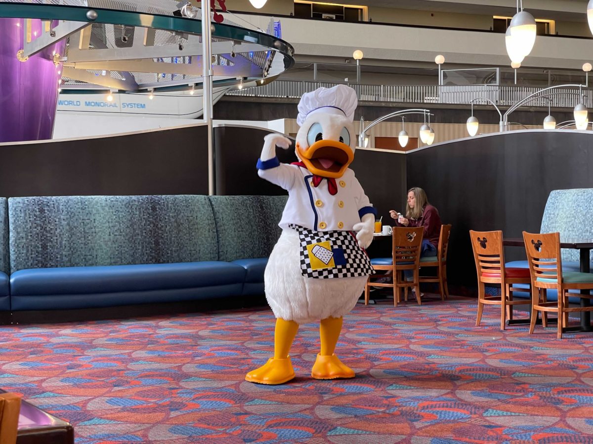First off, you’ll notice that the cacophonous old music loop has been replaced with something far less hectic, but also lacking in personality. Gone is the “Celebrate with Mickey Mouse” music, and instead there’s a voiceover that encourages people to clap their hands, but stay seated as the characters come out to perform this odd “Let’s make some biscuits!” dance. (For the record, there are no biscuits on the menu.) Also gone is the napkin-twirling tradition, although we noticed some people doing it out of sheer habit. Many of these aspects of the restaurant were bound to be lost to time, as they’ve been around for years now, but just keep that in mind in case you’re expecting a dose of nostalgia.