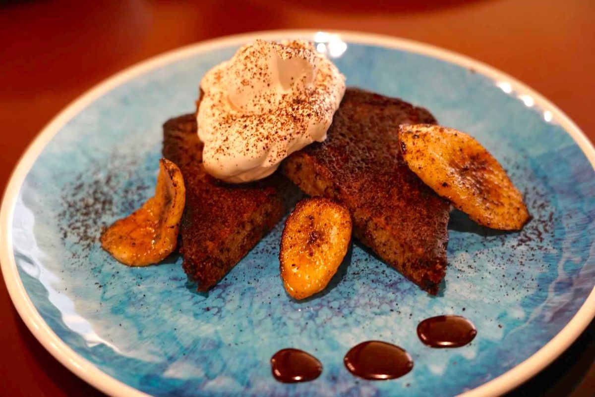 The Banana Bread French Toast is served as two pieces of banana bread garnished with caramelized bananas and mascarpone cream sprinkled with espresso powder. We kind of expected more from this, but it really ended up being nothing more than thin-sliced, cold banana bread with some toppings. It was sweet, but the flavors aren’t as complex as the name, or the ingredients, suggest.