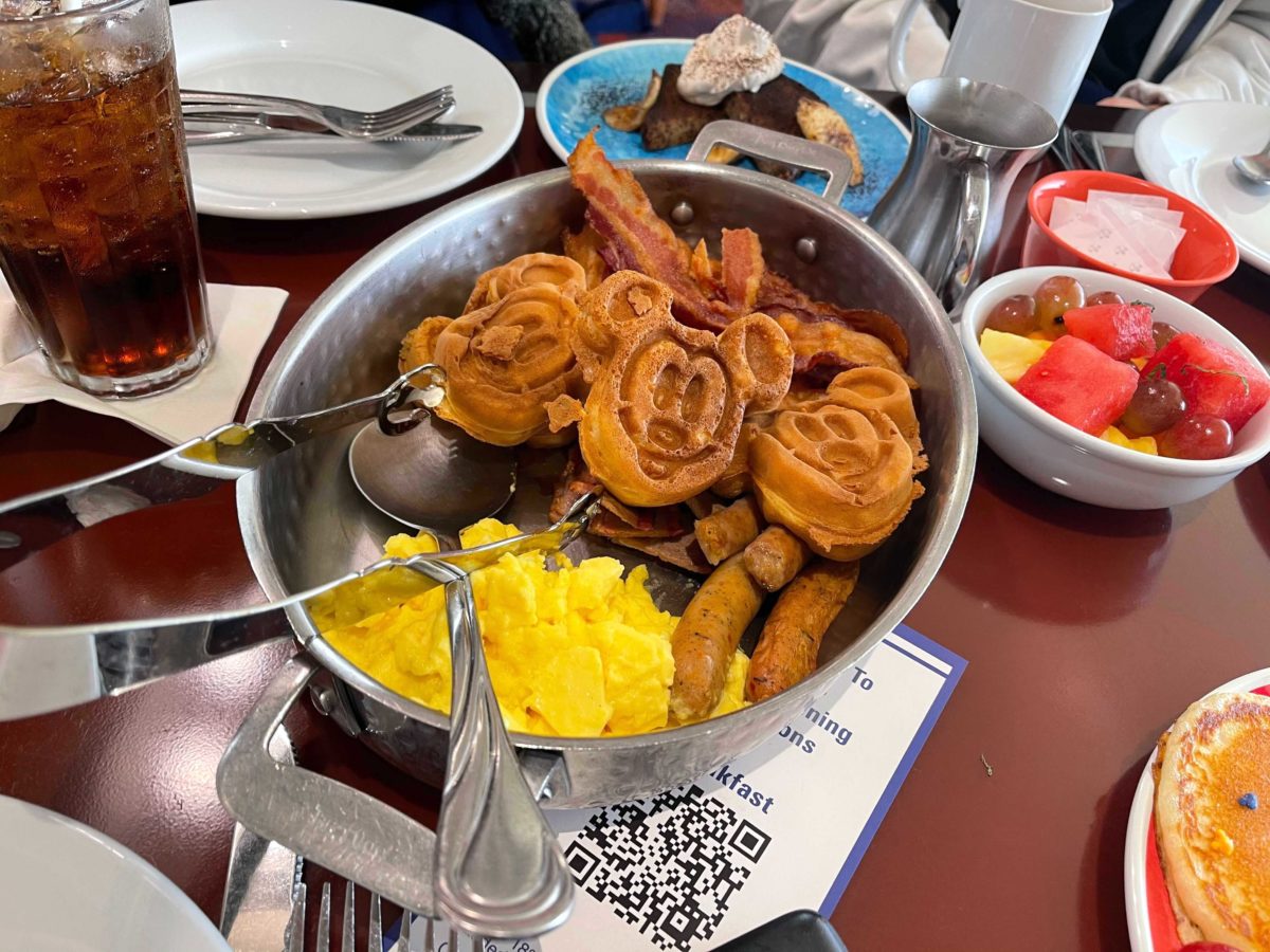 All of the breakfast standards are served in a large skillet, including: scrambled eggs, chicken sausage, slow-roasted beef brisket, Mickey waffles, pork sausage links, and smoked bacon. Plant-based options include Mickey waffles and a tofu scramble.