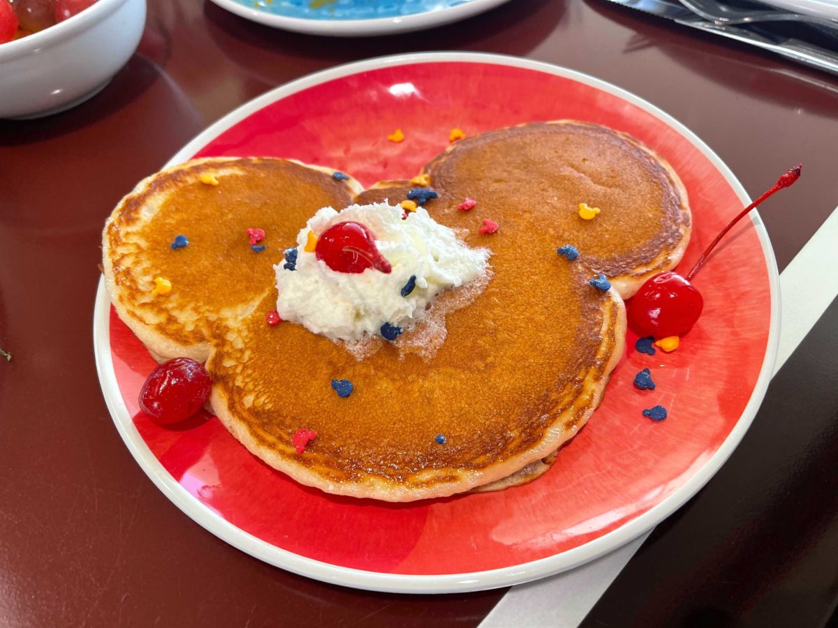 Topped with whipped cream, celebration sprinkles, maraschino cherries, and shimmering pixie dust, this humble Mickey-shaped pancake was probably one of the best things we had this morning.