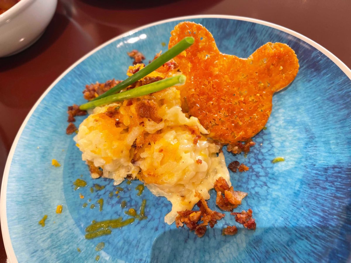 The “Loaded” Potato-Cheese Casserole tasted a bit like scalloped potatoes, but with way more creamy, cheesy goodness going on. If you get the right spoonful, you do get a bite of crispy cheese, which is delicious. The first plate comes with a parmesan Mickey crisp, plus some chives and bacon bits as garnish.