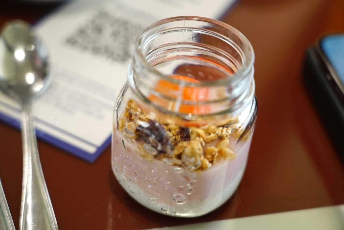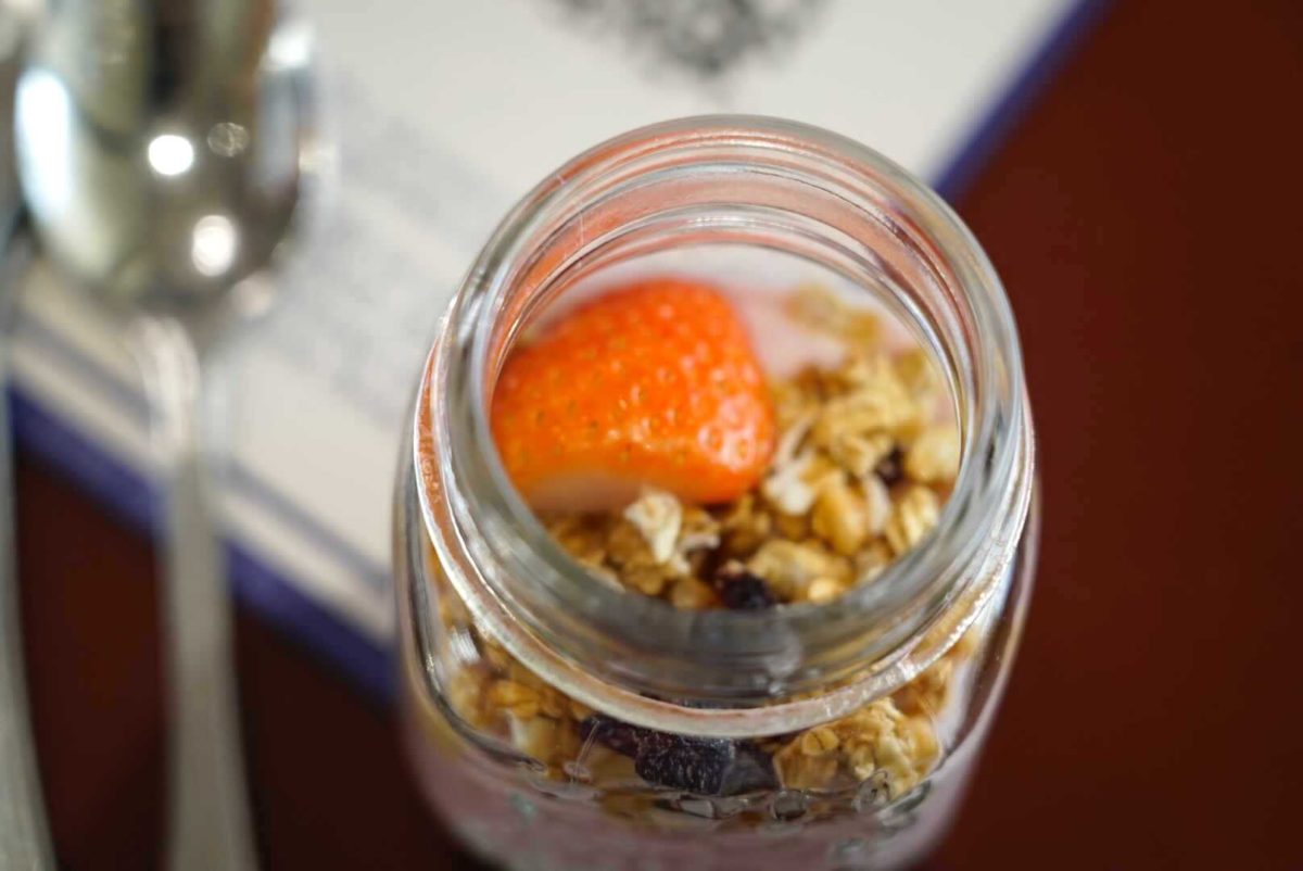 Previously served in a tiny shot glass, these have now been upgraded to mini Mason jars, layered with vanilla, then strawberry yogurt, plus granola and a slice of strawberry on top.