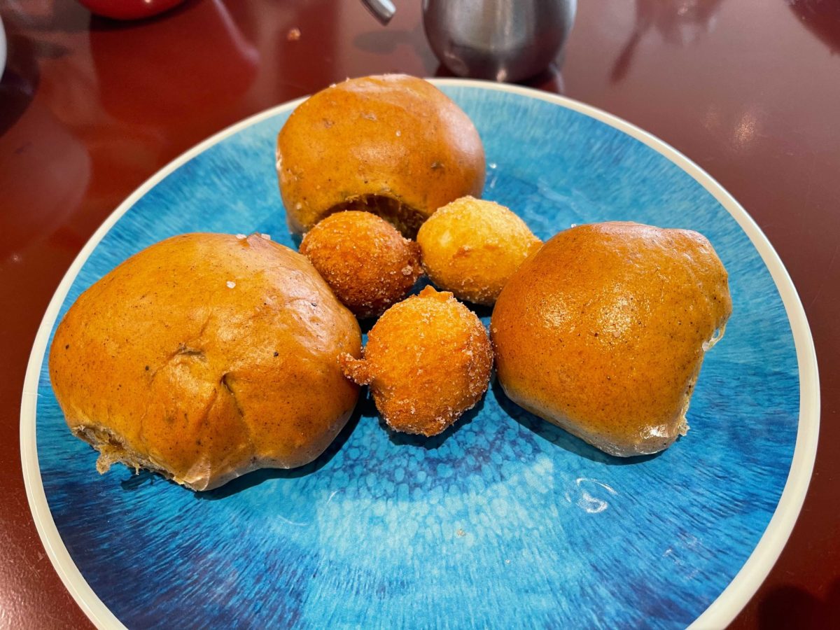 The Harvest rolls are basically Chef Mickey’s version of your standard cinnamon roll, especially once you add the creamy, sweet cream cheese icing on top. There’s a slight pumpkin taste, but we thought the cinnamon flavors won over here. The fritters were far more dense than we expected, dusted in cinnamon sugar for some sweetness, but nothing out of the ordinary.
