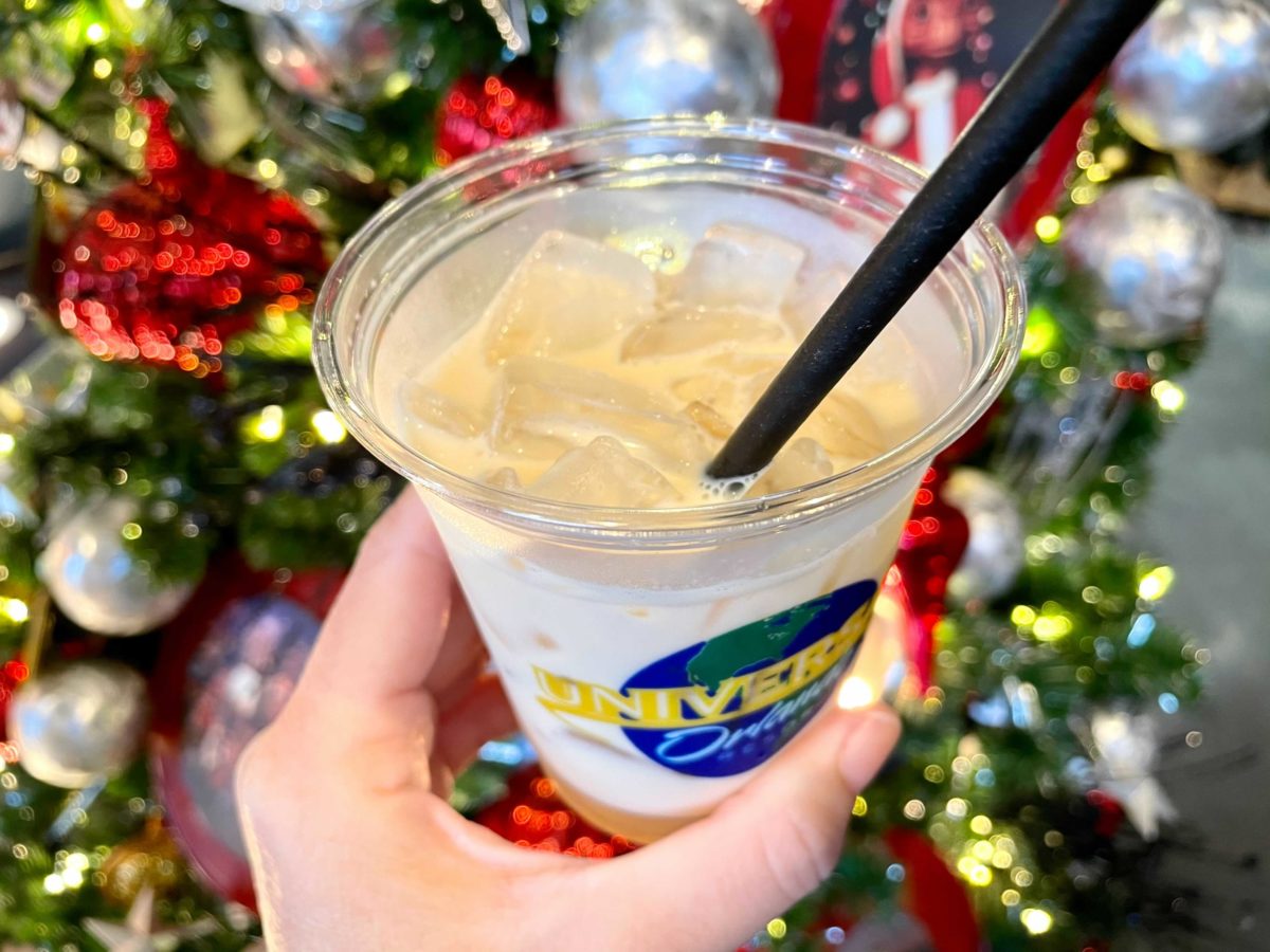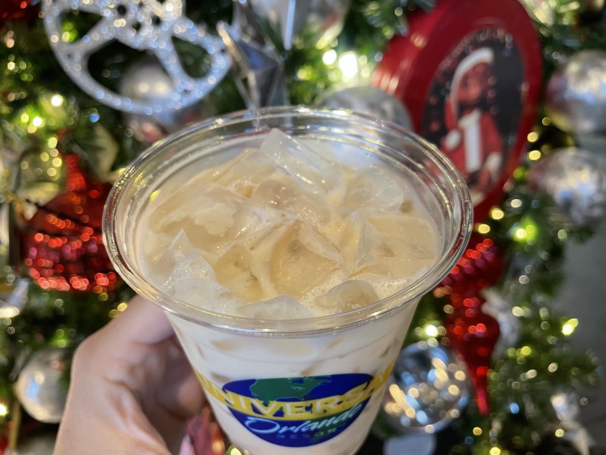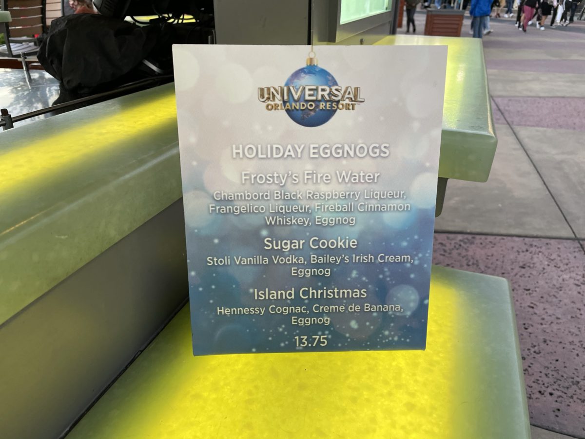 Dockside and Shoreline drink kiosks are currently serving up a variety of alcoholic eggnogs, including an Annual Passholder exclusive. These bars are located near Voodoo Doughnut and Jimmy Buffett’s Margaritaville in CityWalk. We ordered our UOAP Raspberry Truffle Eggnog and watched as it was prepared with great care.