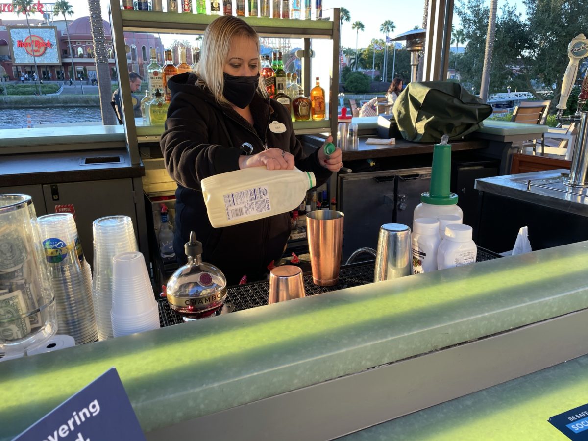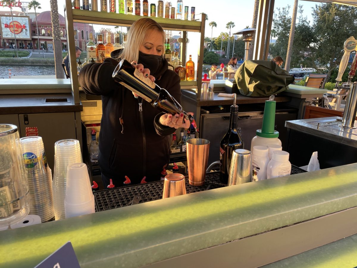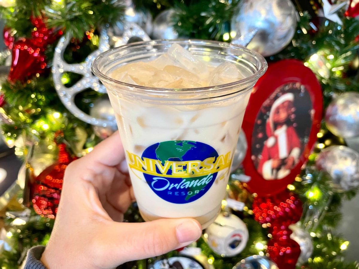 Dockside and Shoreline drink kiosks are currently serving up a variety of alcoholic eggnogs, including an Annual Passholder exclusive. These bars are located near Voodoo Doughnut and Jimmy Buffett’s Margaritaville in CityWalk. We ordered our UOAP Raspberry Truffle Eggnog and watched as it was prepared with great care.