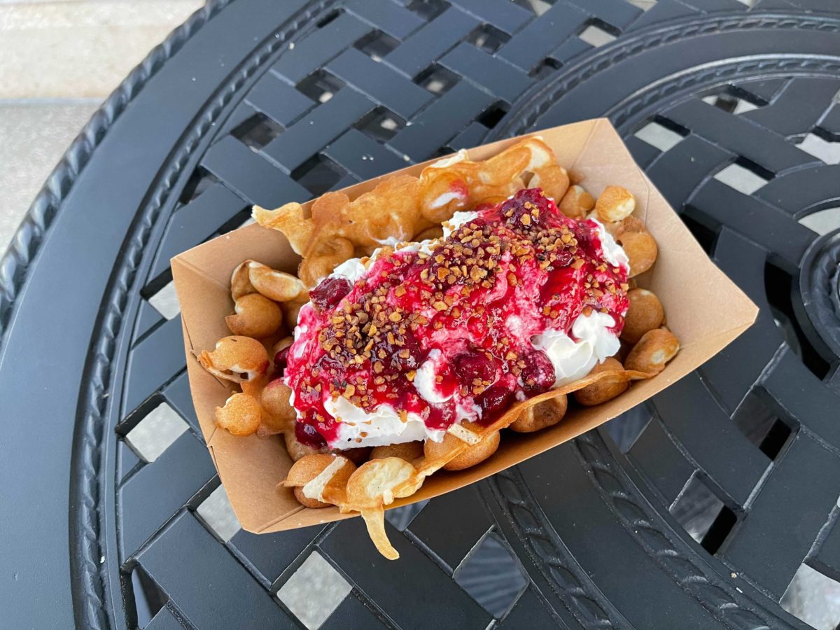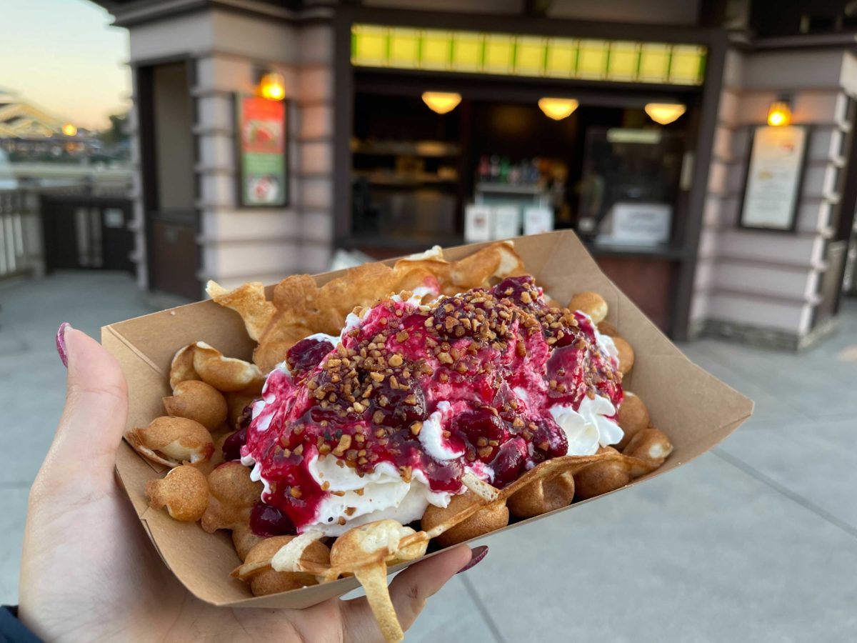 The Bubble Waffle is filled with vanilla ice cream and topped with whipped cream, cherry jubilee sauce, and praline pieces.