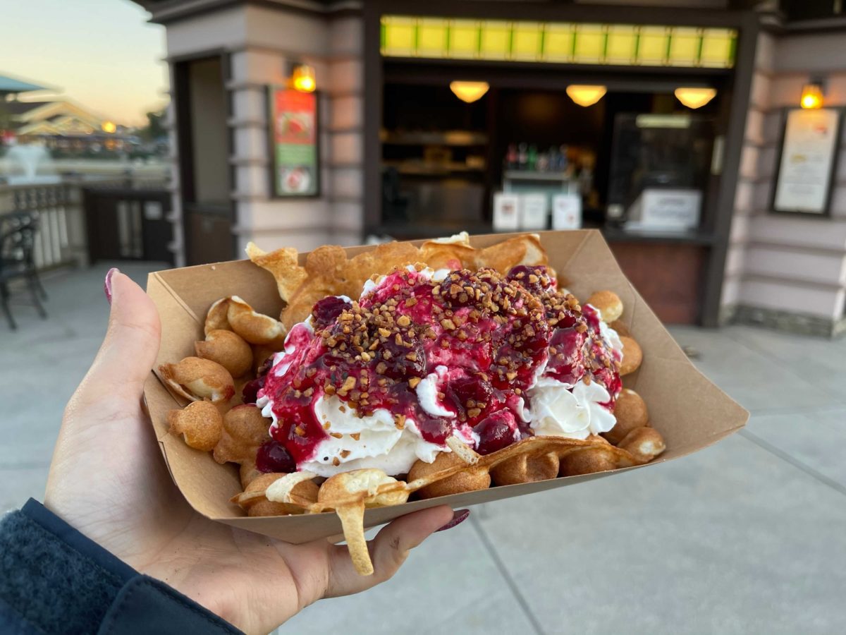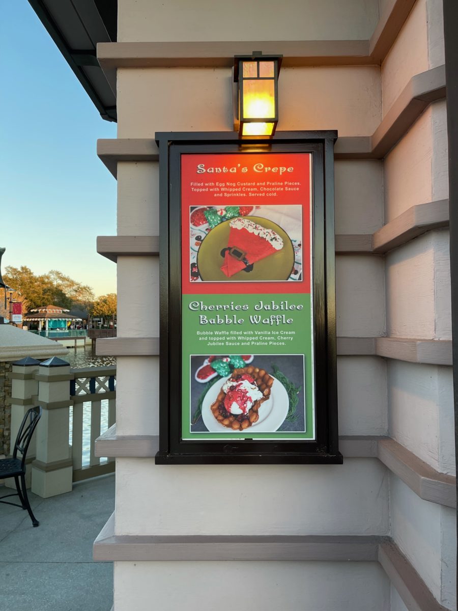 We’re making our way around Disney Springs to try all the new Christmas and holiday treats of the season. We’ve tried the holiday peppermint boba tea at YeSake Kiosk, and now we’re getting some desserts at AristoCrepes.