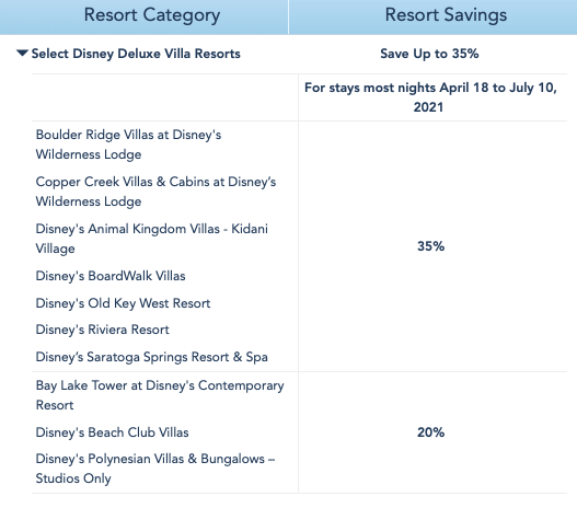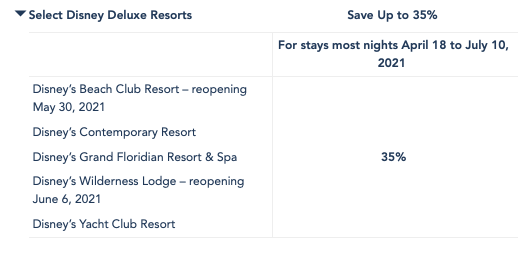 Annual Passholders can save up to 35% on rooms at select Disney Resort hotels for stays most nights April 18 through July 10, 2021. Click here to check availability and book using this discount! Book through July 10, 2021.