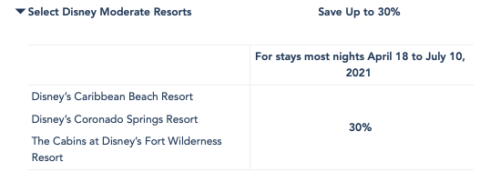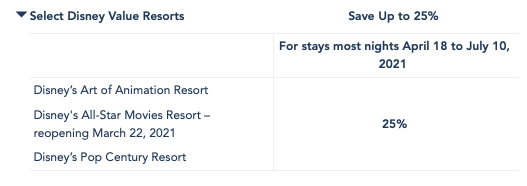 This offer is valid for the Disney Resort hotels listed below. View the chart to explore savings within each Resort Category.