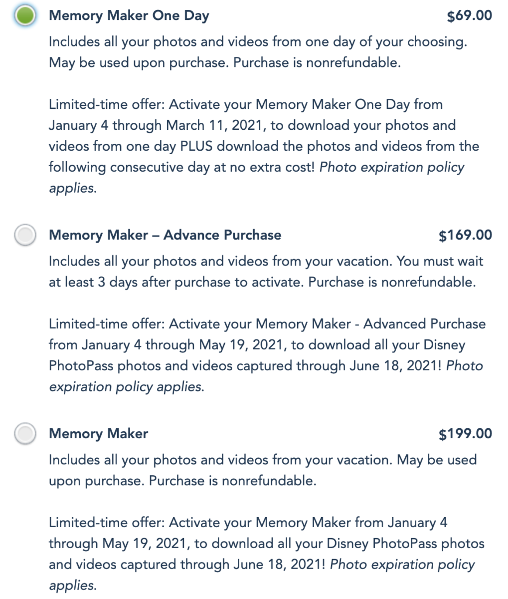 There are two Memory Maker options and each has its own limited-time offer. Guests purchasing the $69 Memory Maker One Day will be able to download one extra day of photos if they purchase their Memory Maker from today through March 11. This effectively makes it a two-day option.