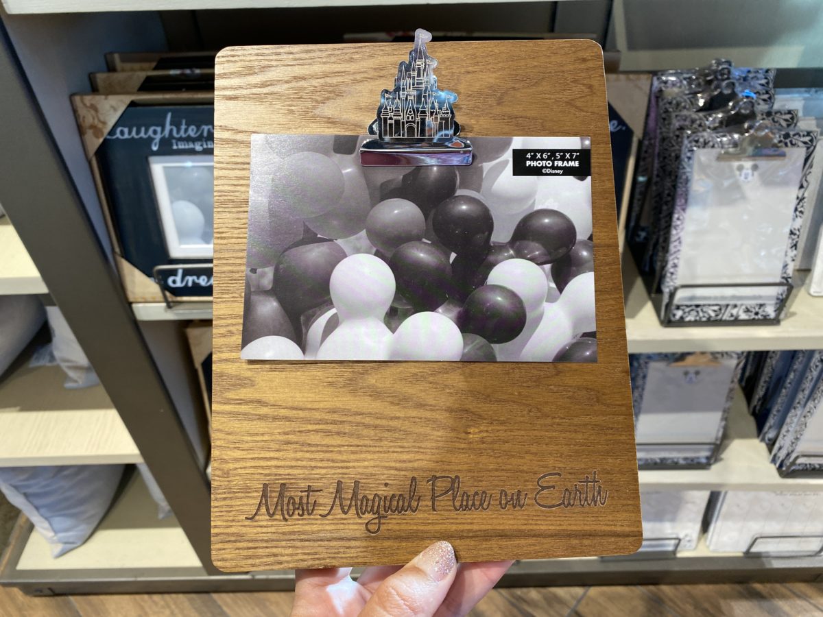We found the perfect way to display your favorite photos with this new photo clip board frame. The functioning clip at the top is shaped like Cinderella Castle, and the phrase “Most Magical Place On Earth” is burned into the wood at the bottom. This frame is available at World of Disney for $24.99.