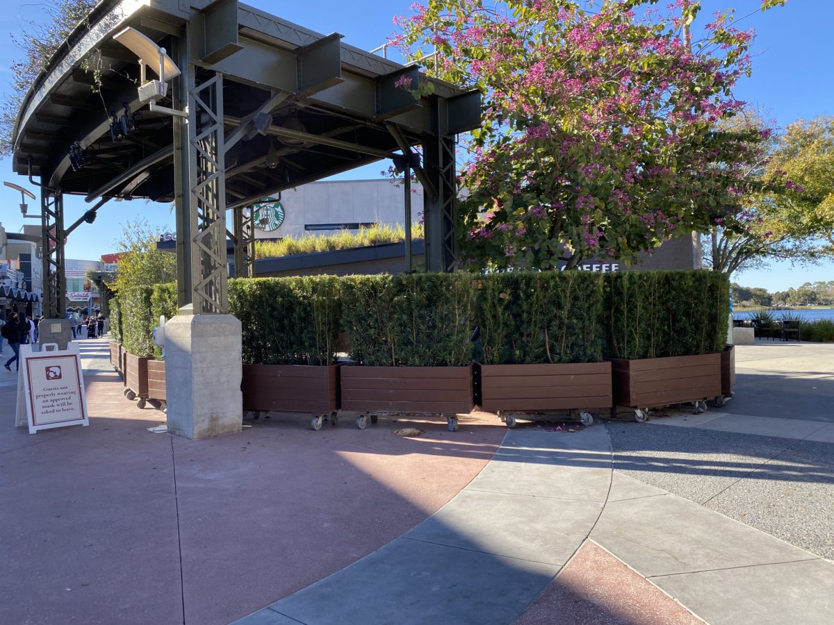 We found more construction at Disney Springs to check on. Planters have appeared underneath the awning near the Aerophile , blocking off concrete work and potentially some plumbing work.