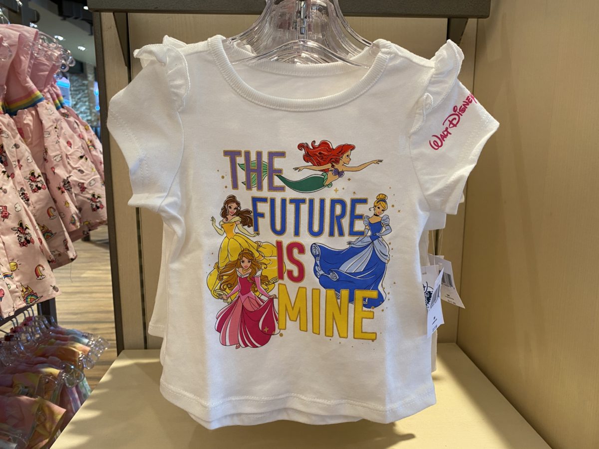 In addition to all the fun princess themed merchandise we found yesterday, today we found this youth shirt featuring the phrase “The Future Is Min” along with four classic princesses. We found it at World of Disney for $17.99.