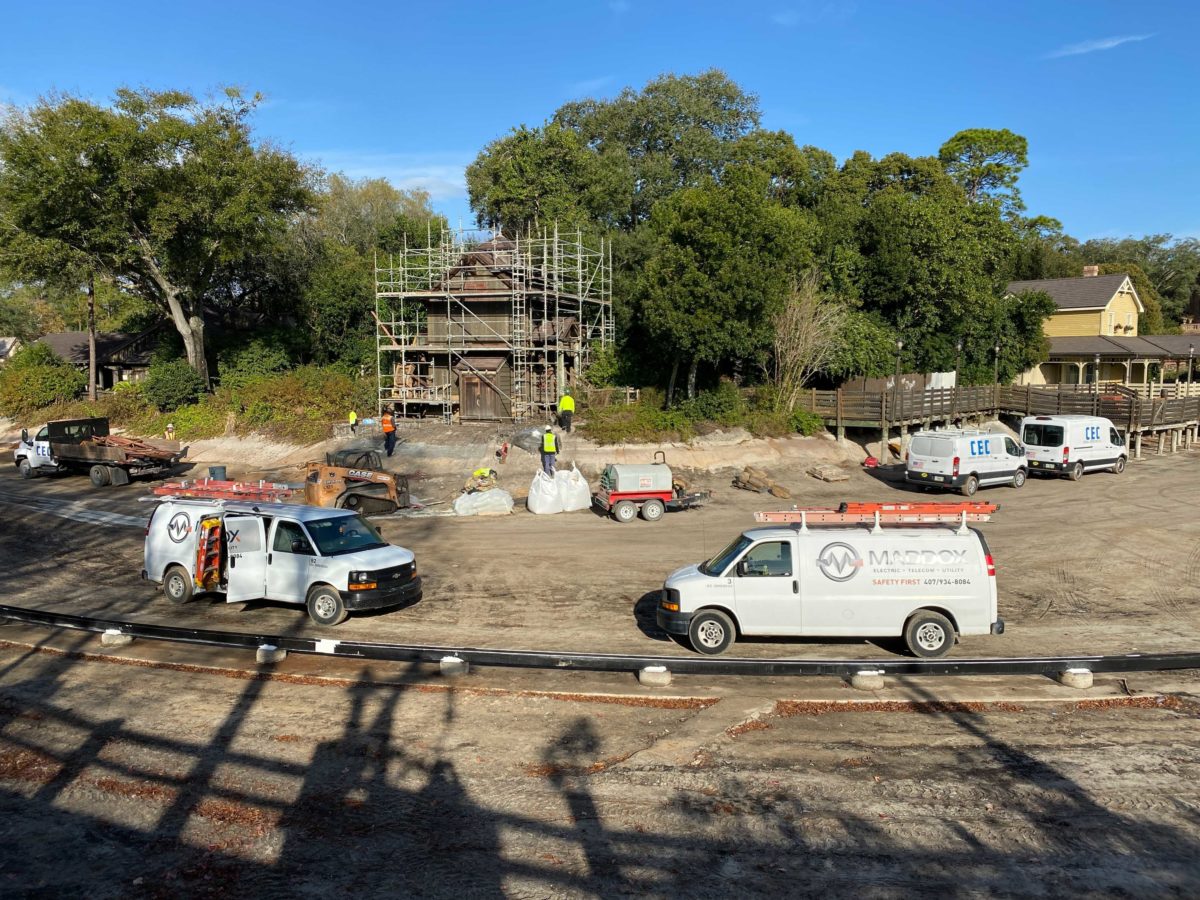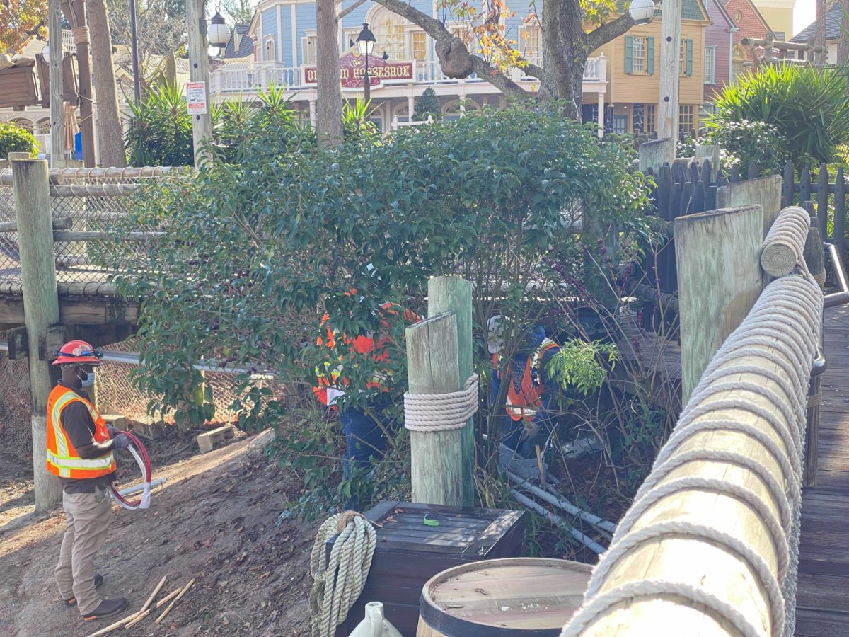 It looks like some work is also being done on the stone wall and barrier separating the building from Rivers of America.