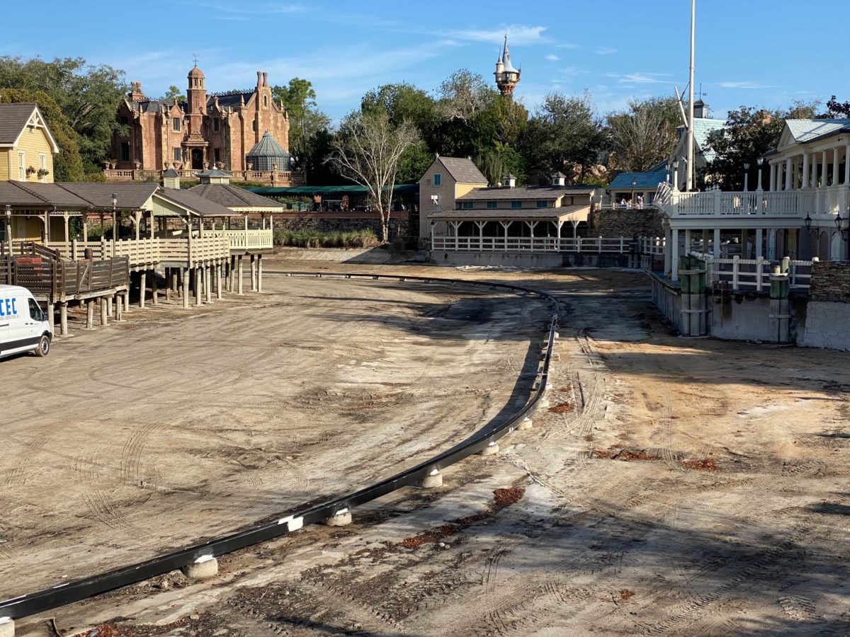 The portion of track curving past the riverboat’s station and towards The Haunted Mansion seems to be complete.